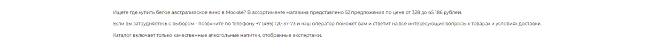 Так как по федеральному закону алкоголь запрещено продавать через интернет, проект не может работать в формате магазина, он имеет право только демонстрировать продукцию. Это накладывает ограничения при работе с семантикой и текстами. Например, нельзя использовать слова «доставка», «интернет-магазин».