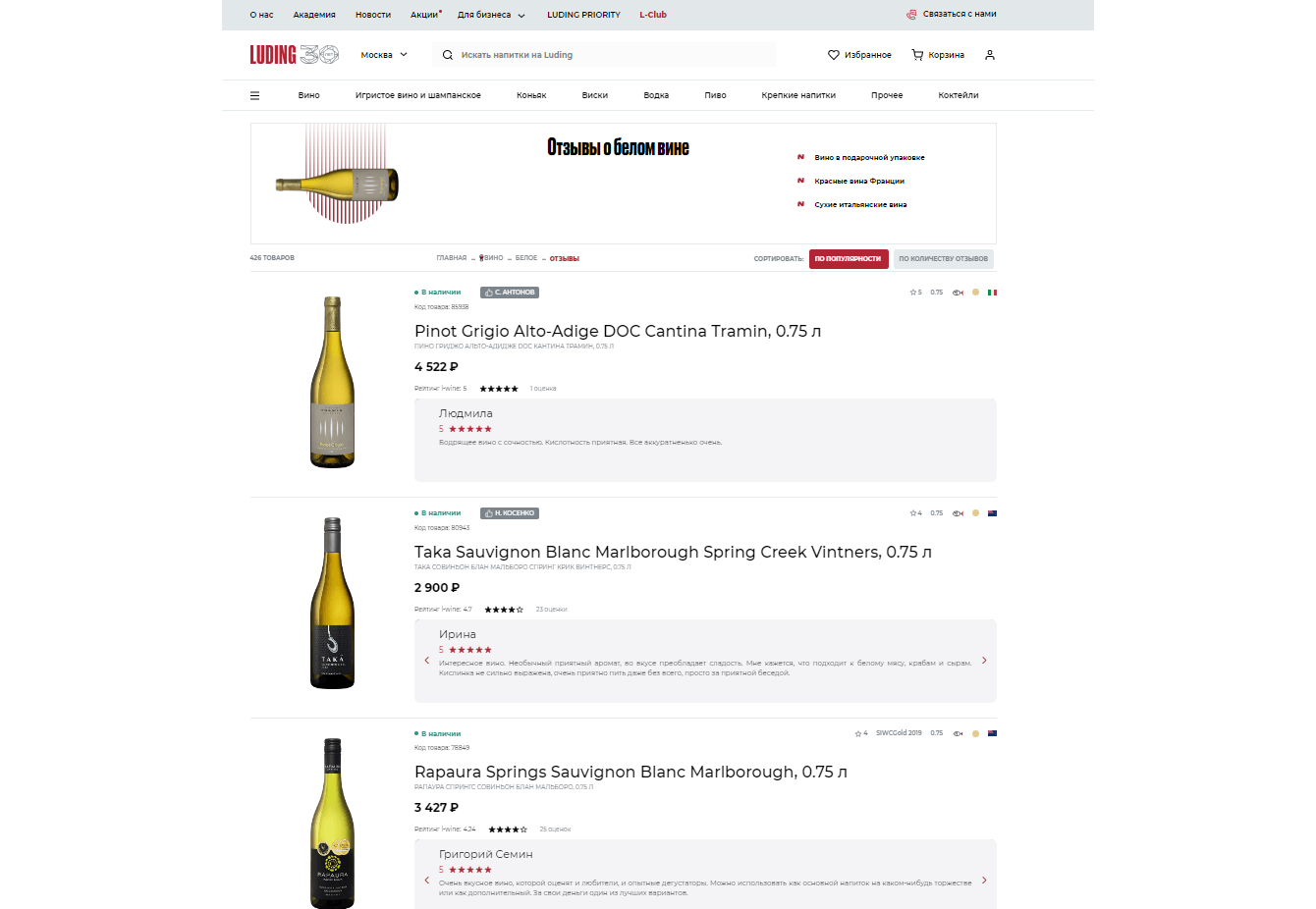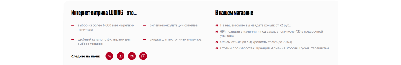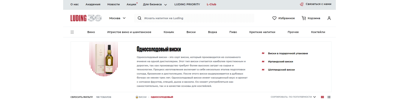 Проект LUDING.RU — наглядный пример того, как глубокое изучение интересов, потребностей и поведения аудитории помогает находить SEO-решения. Посетителям LUDING недостаточно выбрать хороший напиток. Они покупают не просто французское вино или шотландский виски — они покупают легенду. Важно прикоснутся к культуре, образу жизни, стилю, который воплощает марка. Почувствовать себя ценителями, знатоками и транслировать это знание семье и друзьям. Мы делаем так, чтобы контент и функционал сайта — от фильтров до экспертных статей — были заточены на интересы пользователя. Маркетинговые и SEO-задачи здесь дополняют друг друга и вместе работают на результат.