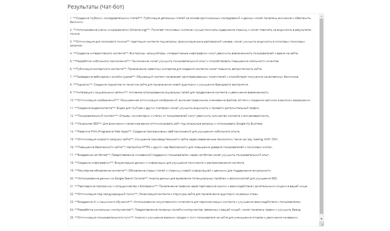 По большинству пунктов невозможно не согласиться с «коллегой». Многое из того, что предложила нейросеть, мы уже используем в этом проекте, например, создание экспертных статей, оптимизация пользовательских путей и скорости загрузки. Другие пункты (создание подкастов, оптимизация для голосового поиска, развитие PWA) — вполне рабочие идеи, которые можно использовать в качестве гипотез.