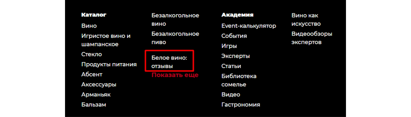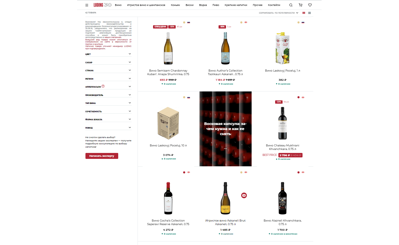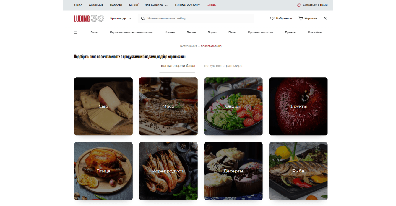 Информационный раздел стал мощной точкой роста не только трафика, но и продаж. Например, человек, который заходит на сайт по инфозапросу [какое вино сочетается с сыром], с высокой долей вероятности захочет купить подходящий напиток. Именно с таким расчетом была создана подкатегория «Подбор вина», где можно выбрать марку по сочетаемости с продуктами и национальными блюдами.