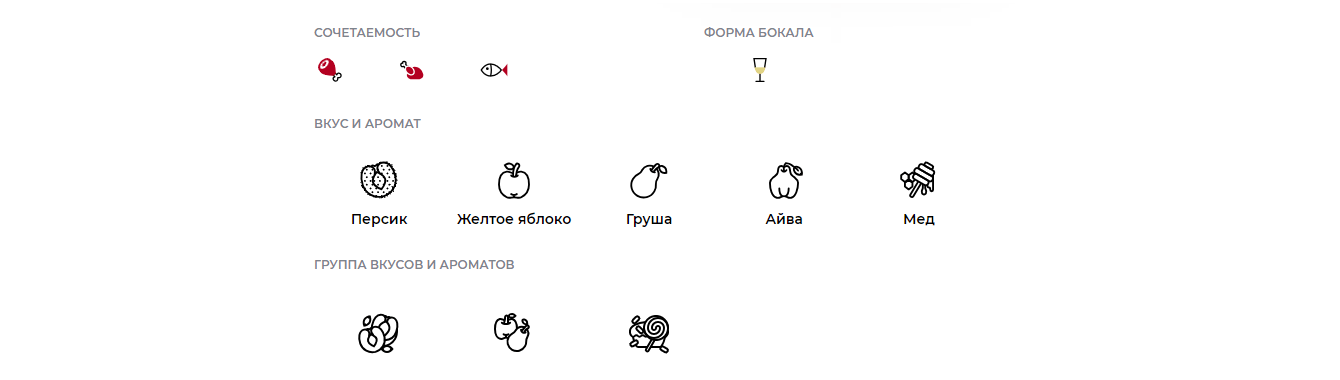 ➡️ Реализовали блоки сочетаемости, формы бокала, вкусов и ароматов. Каждая иконка содержит ссылку на соответствующую подборку.