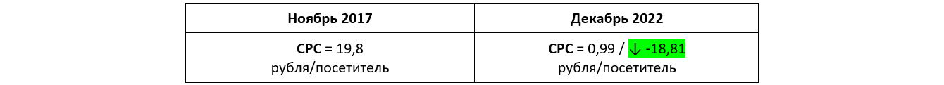 Стоимость привлечения посетителя без учета поискового трафика по брендовым запросам сократилась на 95%.