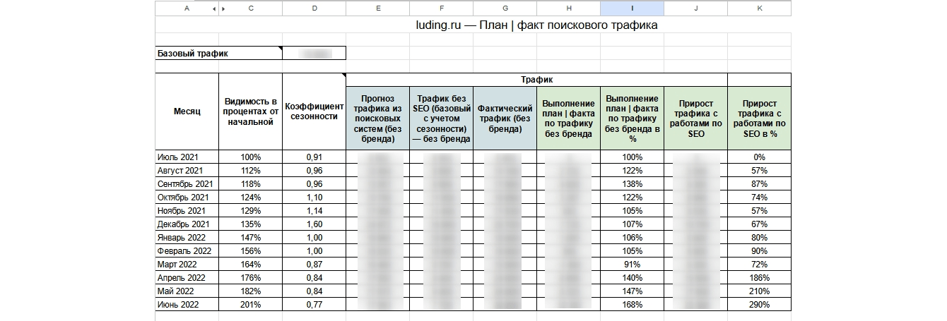 Для проекта LUDING.RU мы построили план роста трафика с учетом сезонности. Каждый месяц мы фиксируем результаты — показатель видимости, число визитов, прирост SEO-трафика в процентах от первоначального трафика и в процентах от плана. Например, мы видим, что в июне 2022 года удалось поднять трафик на 290%, что составляет 168% от плана.