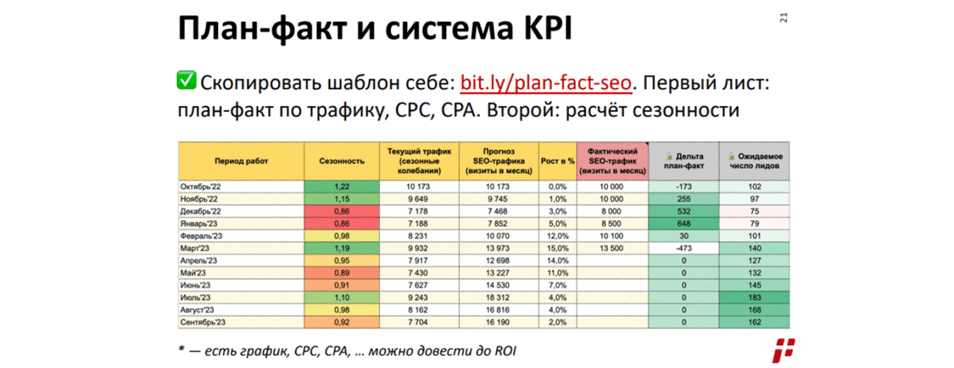Таблица построена на основе разработанного нами шаблона План/факт. Возможно, вам он тоже будет полезен. Скачать шаблон можно по ссылке: https://bit.ly/plan-fact-seo.
