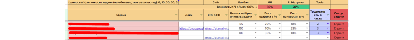Например, в этой таблице мы оценили значимость задач для нашей компании с учетом всех этих параметров.