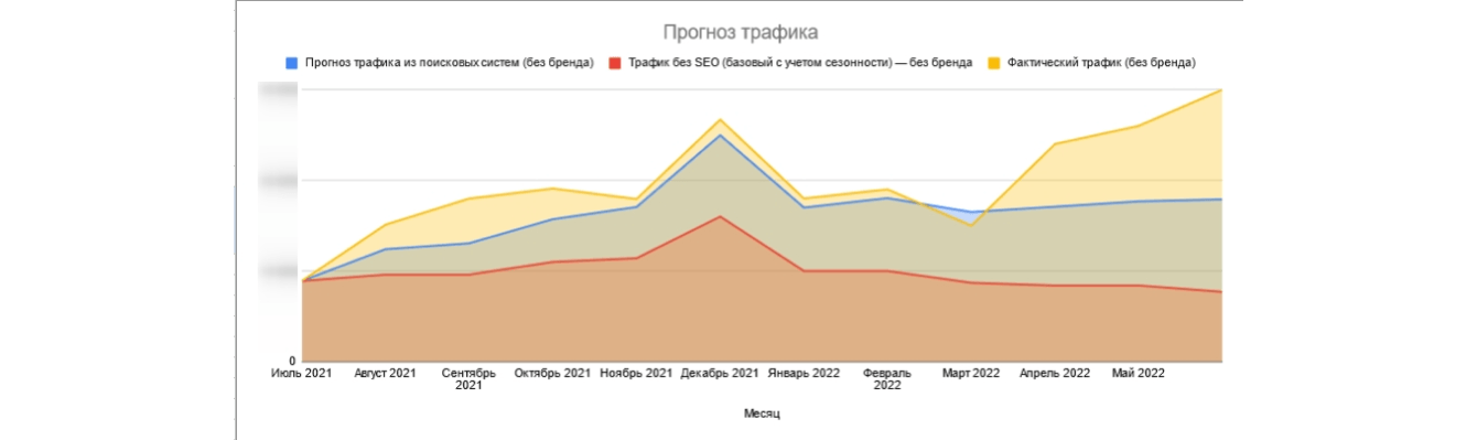 Здесь прогноз и фактические показатели для наглядности выражены в графическом виде. Желтым цветом выделен фактический трафик без брендовых запросов. Красным обозначен трафик без проведения работ по оптимизации (без SEO).