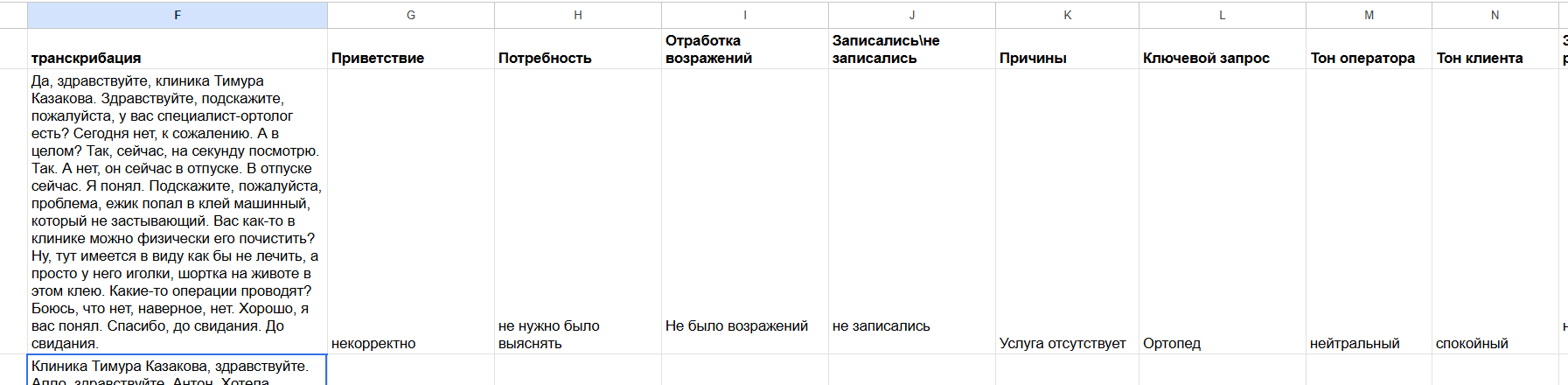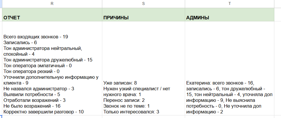 Подключили транскрибацию и разметку звонков по чек-листу (приветствие, тон, запись/итог звонка и др.), собрали сводку по периодам и по операторам.