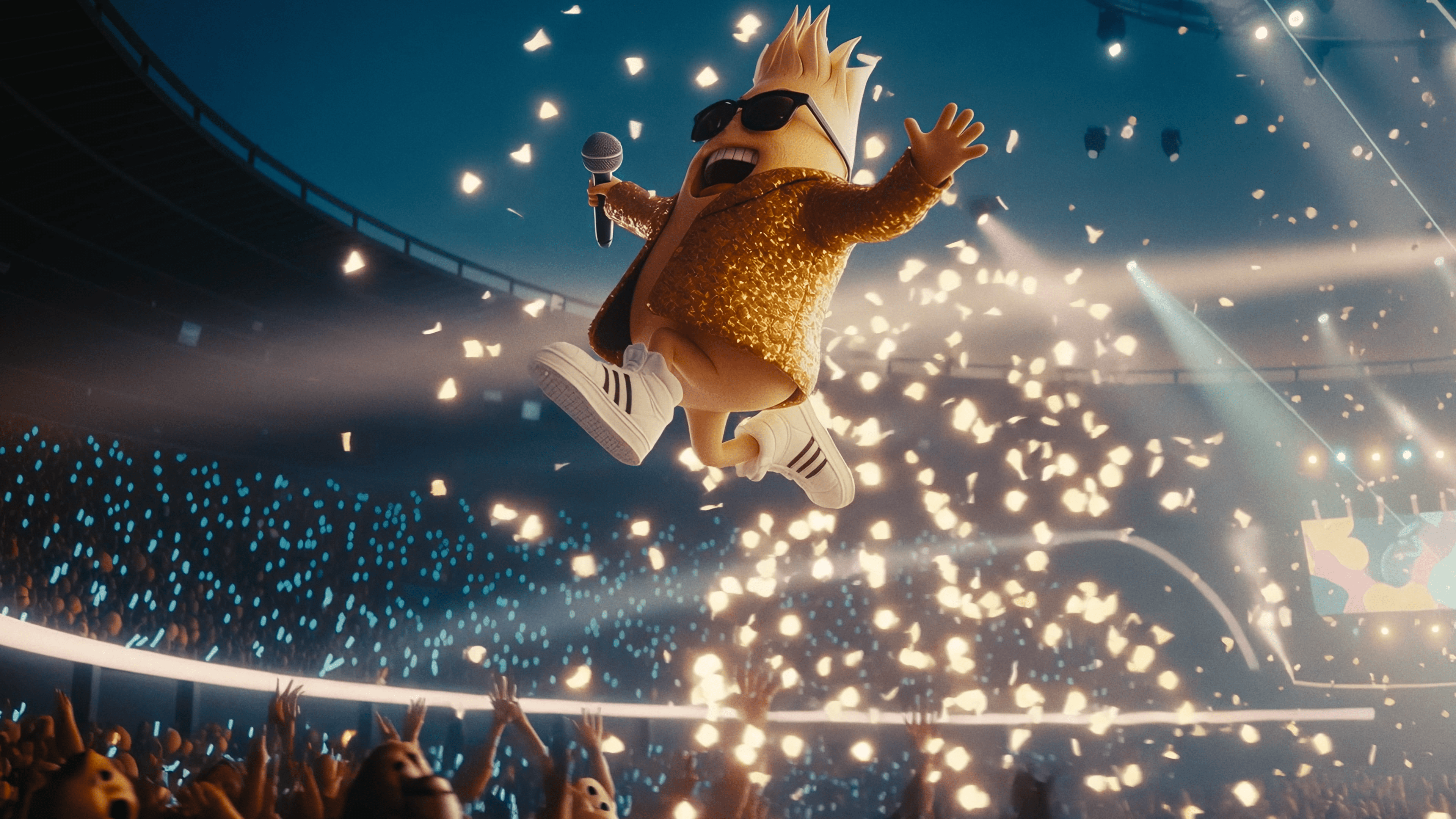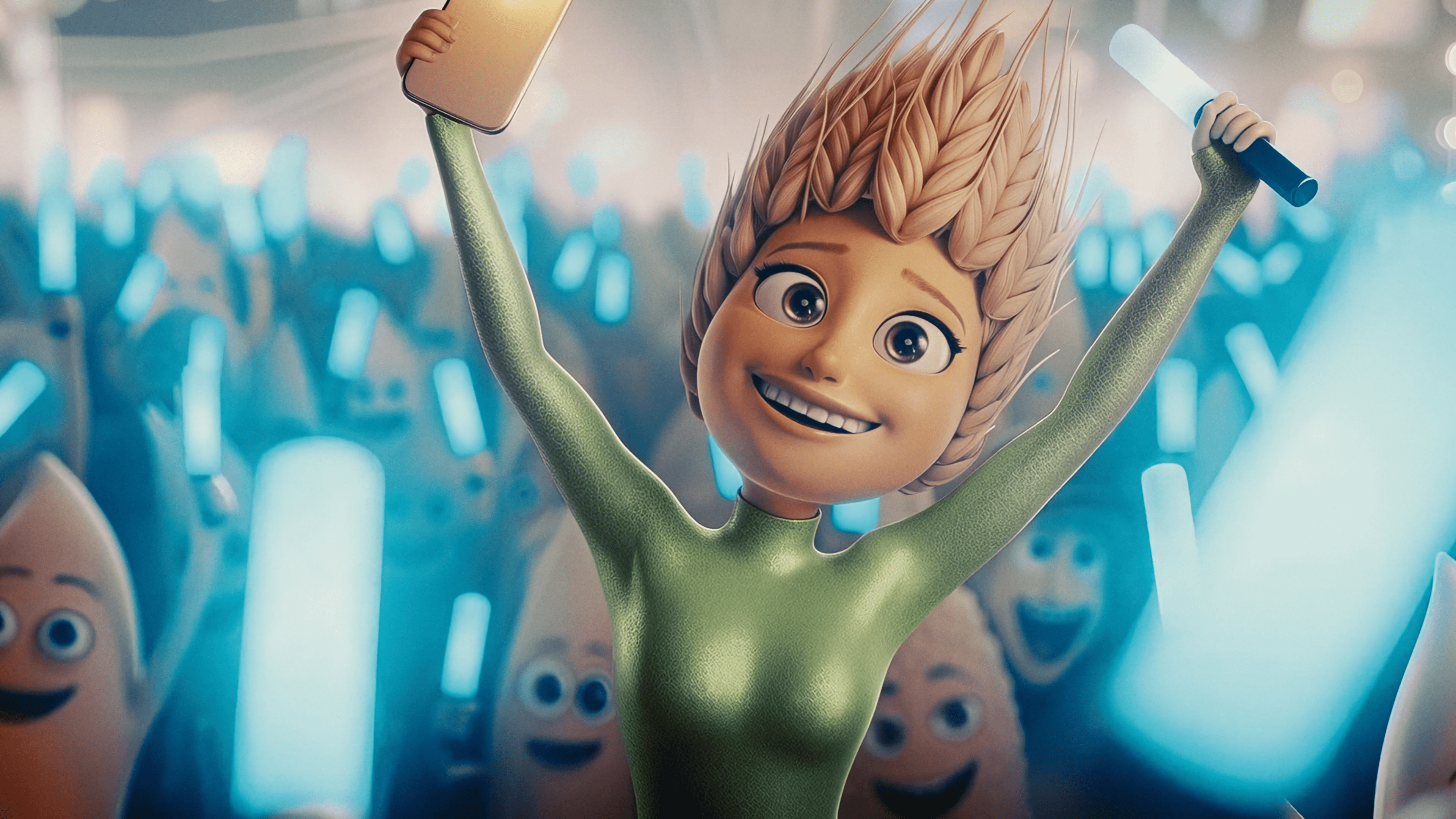 Чтобы придать истории масштаб, командой выбран антураж стадионного концерта. Вместо людей в зале — восторженная толпа злаков-фанатов, ликующих в такт музыке. В финале ролика раскрывается шутливый замысел: грандиозный концерт на самом деле происходит внутри миски с кашей — метафора бодрого утра. Этот приём не только вызывает улыбку, но и связывает креатив с продуктом: в последних кадрах зритель видит тарелку каши и новую упаковку хлопьев, благодаря чему обновлённый дизайн прямо показан аудитории в контексте сюжета.