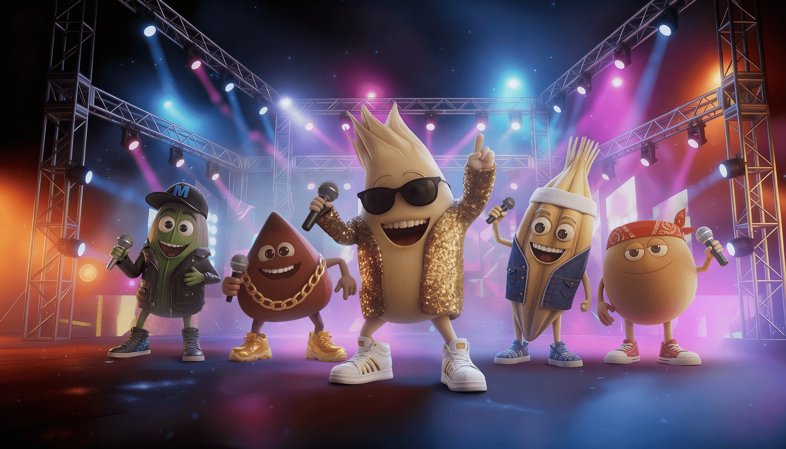 Мы подошли к задаче творчески и вместо обычного рекламного ролика выпустил полноценный музыкальный клип. На сцене — бойз-бенд из злаков «Пять злаков», созданный с помощью нейросетей, который исполняет зажигательный соул-трек перед толпой фанатов-злаков. Главные герои кампании – сами злаки (Овёс, Гречка, Рожь, Пшено и Ячмень), представленные как участники поп-группы с яркими индивидуальностями. Такой нестандартный подход превращает продукт в «звёзд шоу» и делает рекламу формой развлечения: зрители увлекаются музыкальной историей и незаметно запоминают обновлённый образ бренда. Кроме того, использование AI для создания видео и музыки подчёркивает инновационность бренда и сразу привлекает внимание аудитории и отрасли.