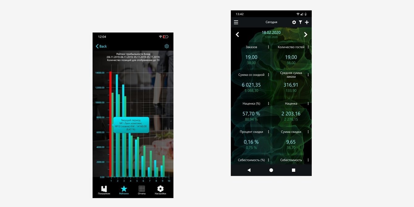 Разработанное специально для маркетолога, владельца ресторана или сети ресторанов и администратора. В данном мобильном приложении пользователь имеет возможность настраивать любое количество показателей для анализа, менять их расположение, проводить анализ динамики изменения показателей и видит все это на графике. Удобные настраиваемые рейтинги позволяют детально изучить информацию о работе ресторана. Так же, с помощью этого функционала, можно получать информацию в табличных отчетах со встроенными 3D графиками.