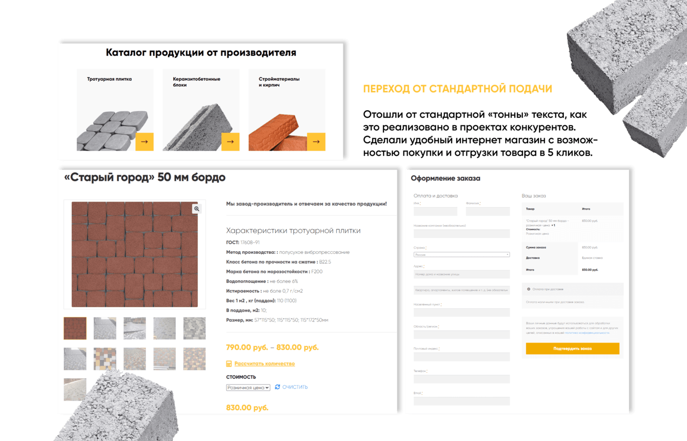 Основная задача проекта была — сделать его максимально доступным для простых пользователей, которым необходимы стройматериалы: показать понятный каталог товара; сделать калькулятор, который помогал бы рассчитать стоимости; корзину, в которой удобно можно было бы собирать заказ и отправлять заявку.