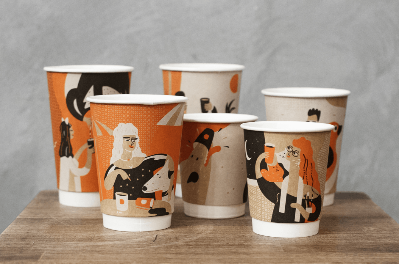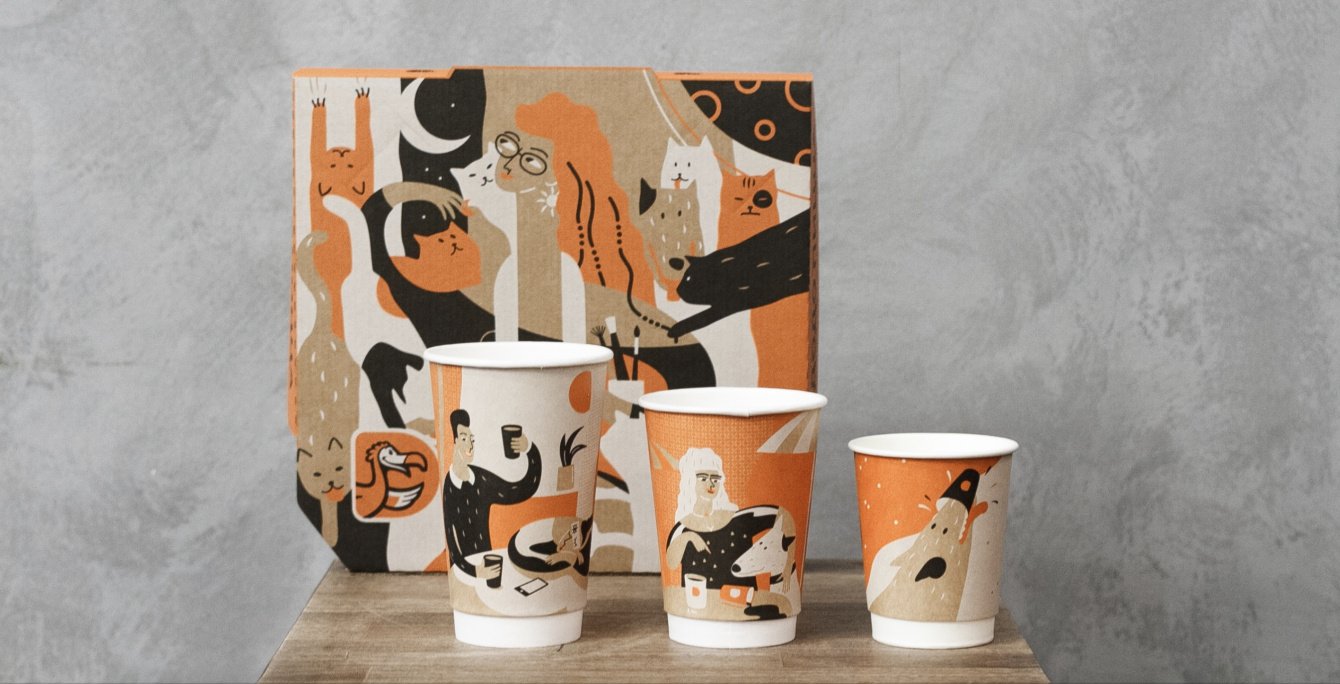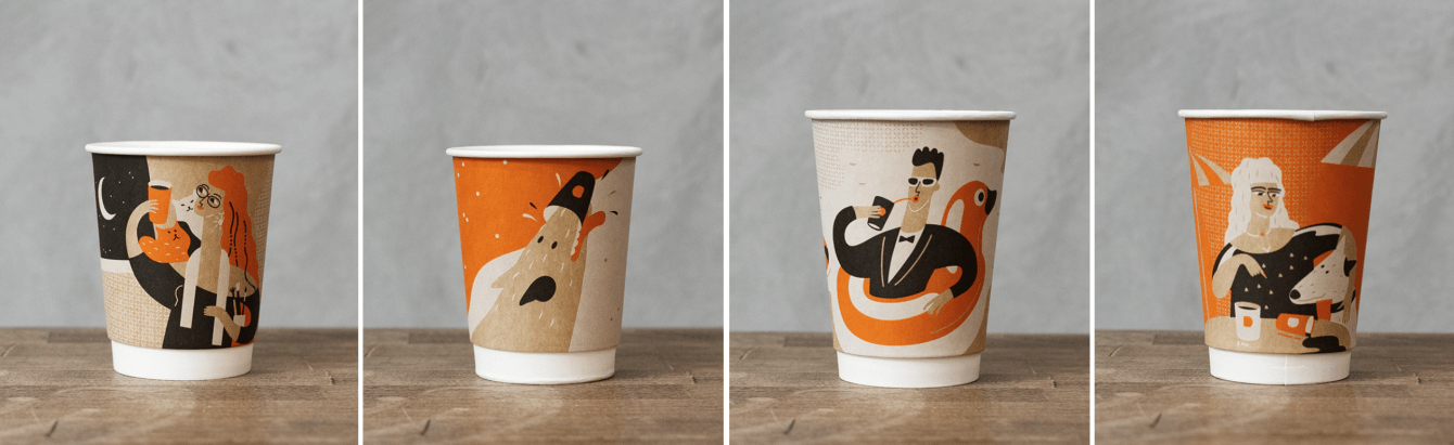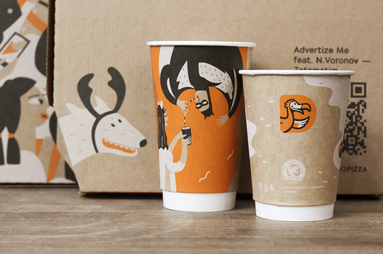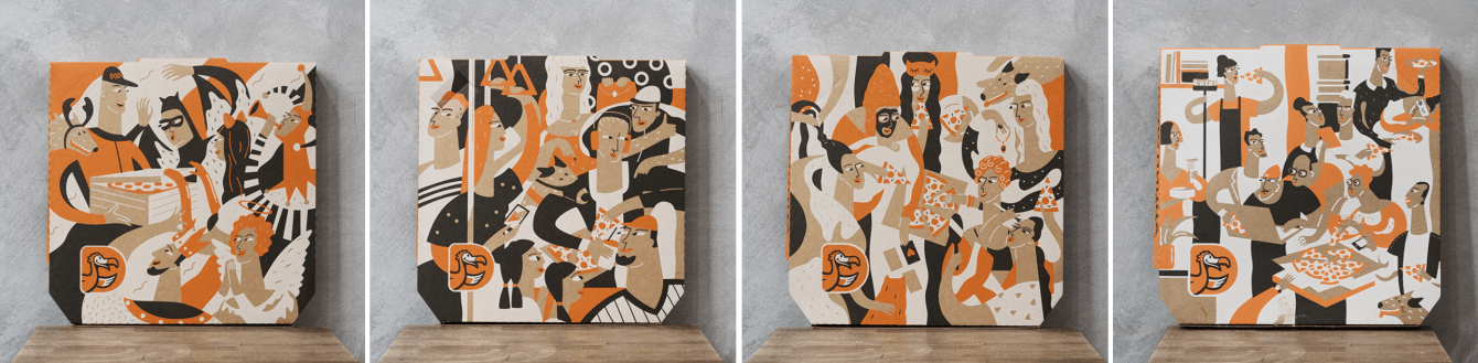 В рамках проекта мы создали иллюстрации для девяти различных коробок для пиццы, нескольких бумажных стаканчиков и коробочек для закусок.