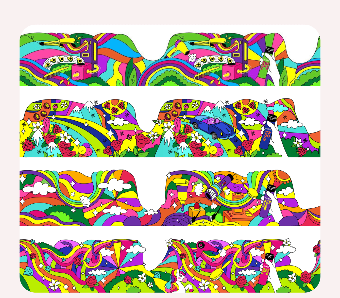 Фронтальные иллюстрации было решено дополнить круговым принтом. Река цвета растекается по всей поверхности коробки, объединяя все элементы в цельную композициию. Круговые иллюстрации стали отличным дополнением к общему дизайну коробки.
