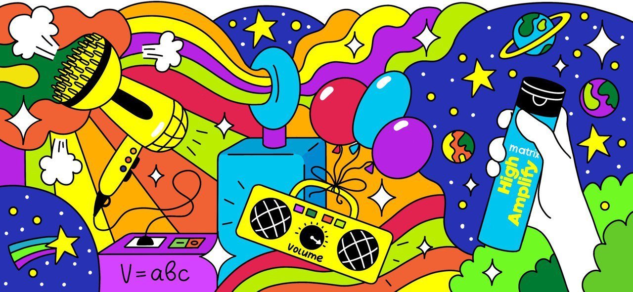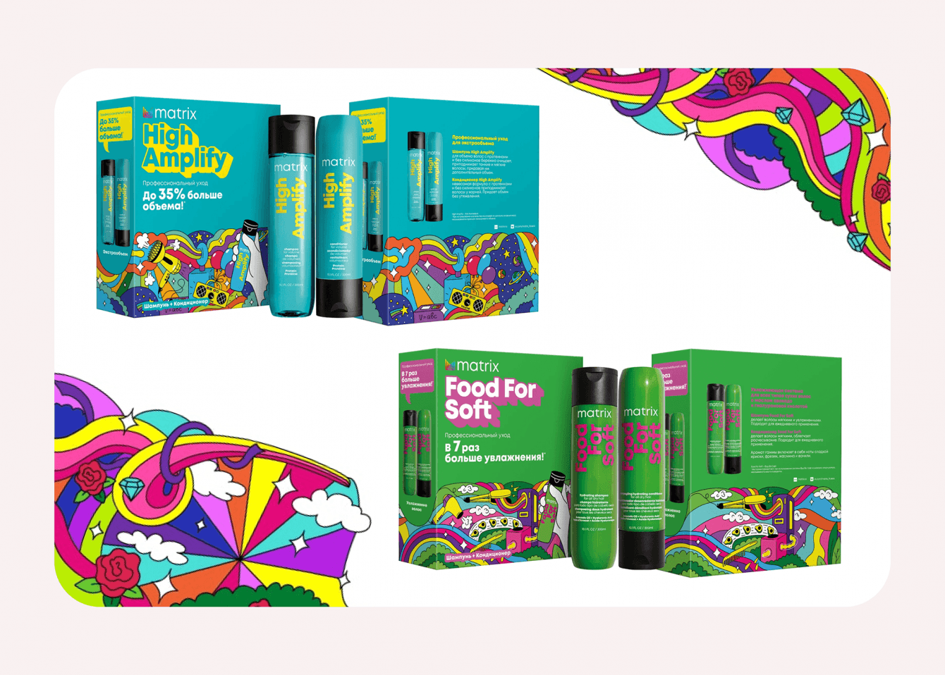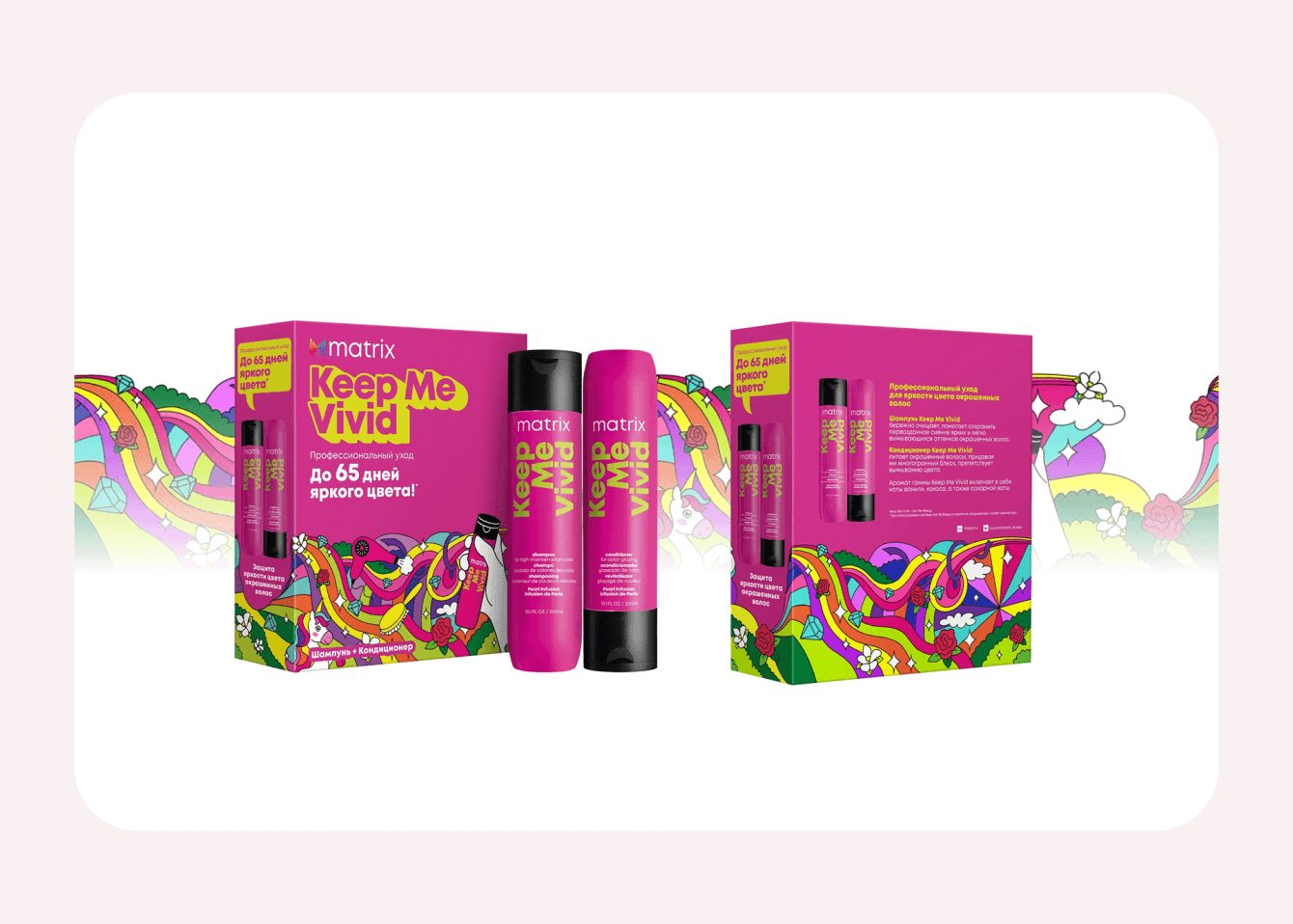 Мы разработали ряд ярких иллюстраций, наполненных интересными элементами. Каждая упаковка отражает свойства конкретного уходового средства. Так, для линии High Amplify – категория средств для увеличения объема и густоты волос – была выбрана тематика космического неба и невесомости. Для средств Brass off, сохраняющих холодный оттенок окрашенных волос — "холодный" дизайн с заснеженными вершинами гор. А упаковки линейки Keep Me Vivid, созданной для защиты яркости цвета и усиления блеска, наполнены мерцанием драгоценных камней.