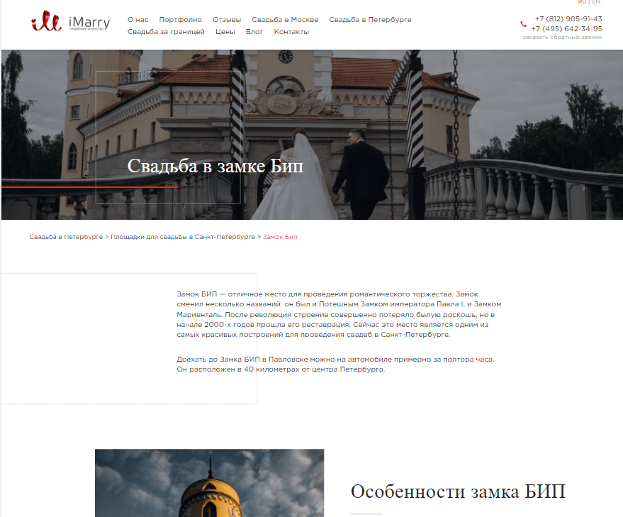 Таким образом, на сайте появилось два больших раздела: “Свадьба в Санкт-Петербурге” и “Свадьба в Москве” с отдельными страницами услуг: