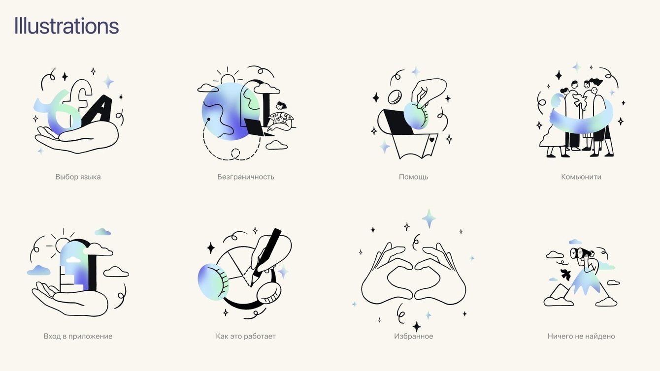 Поиски продолжались, пока стиль случайно не сложился из маленьких кусочков культурной ДНК страны. Фиолетовая незабудка, бледно-песочный тёплый цвет, шрифты с мягкими засечками, иллюстрации, которые к ним подходят. Так после нескольких неудачных попыток получили то, что пользователь видит сейчас. Ниже пример как стиль работает и раскрывается сейчас.