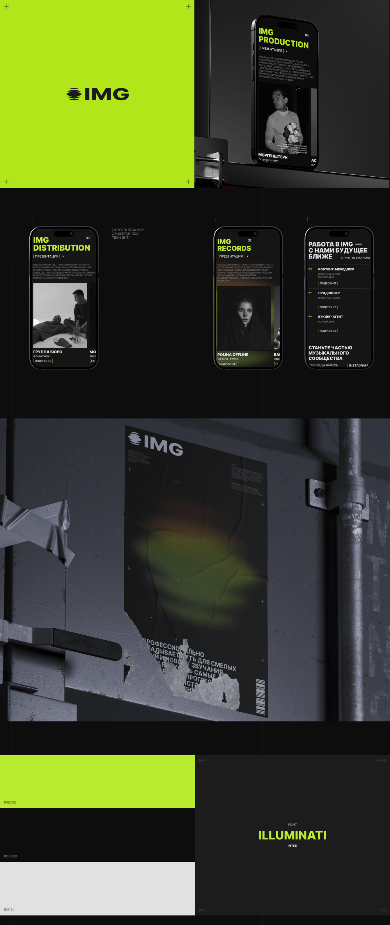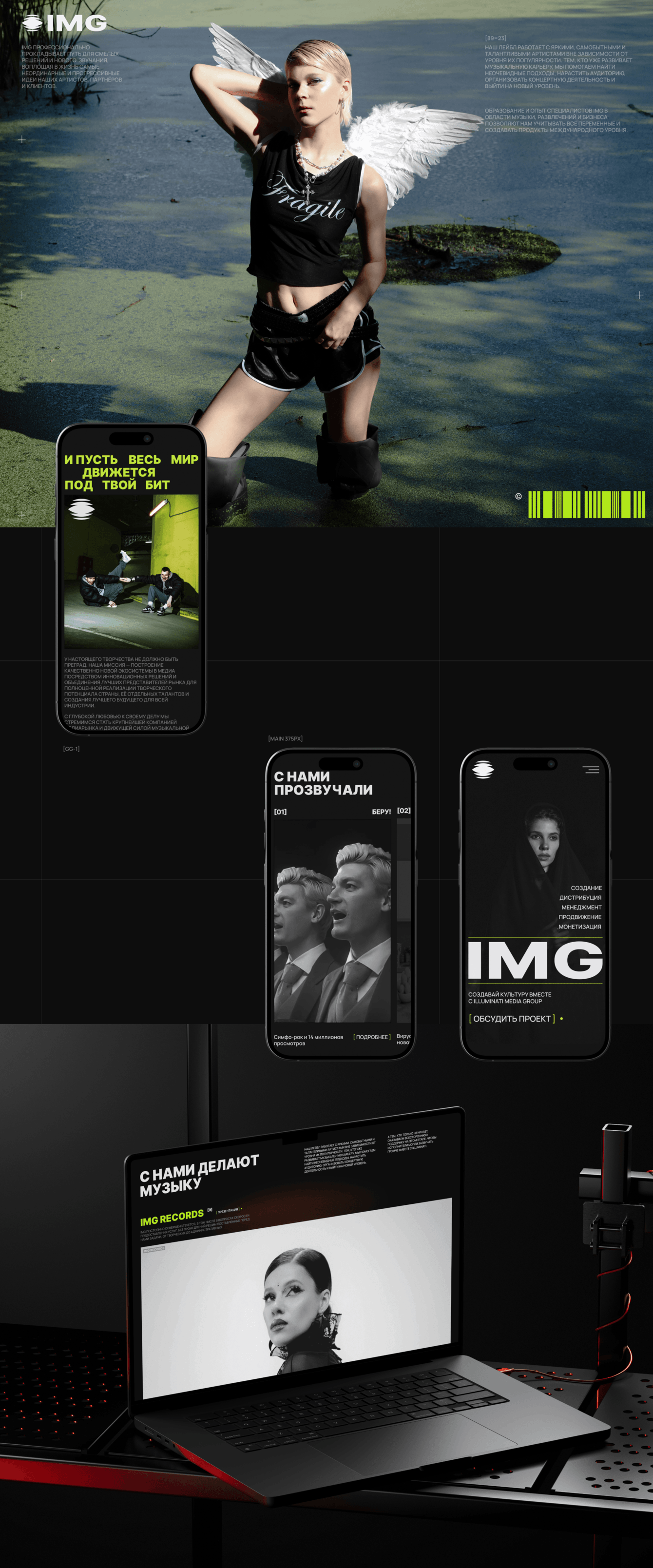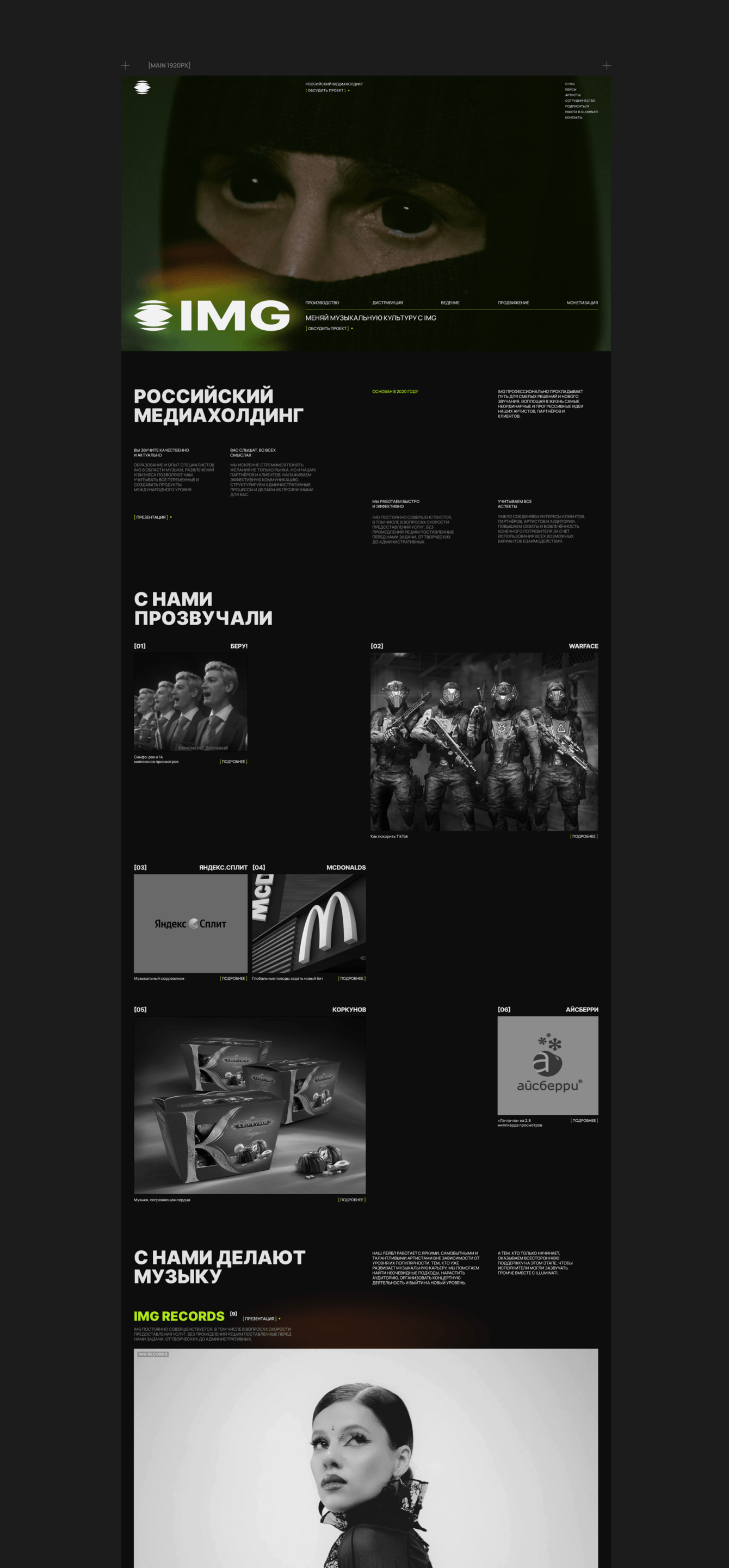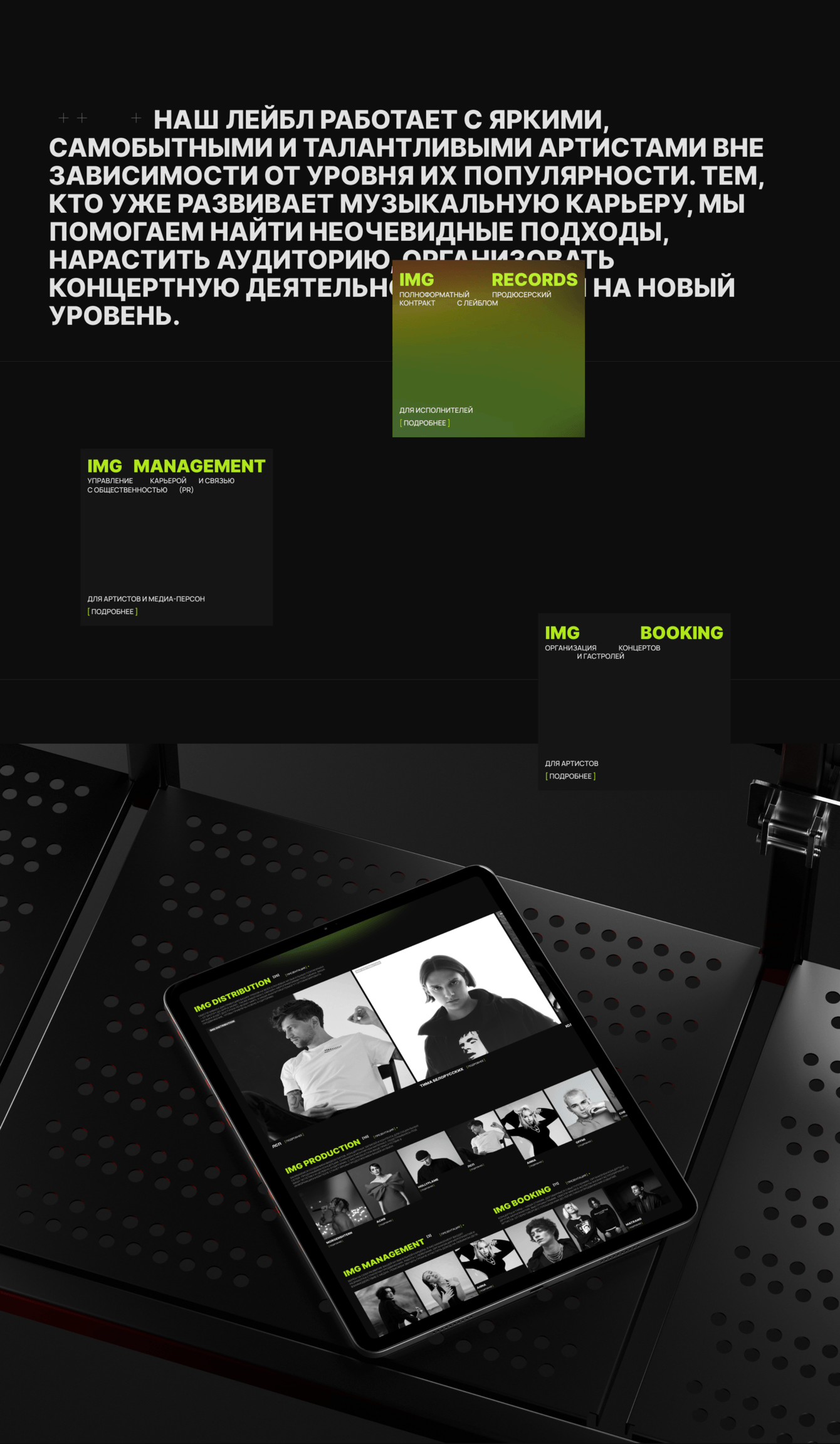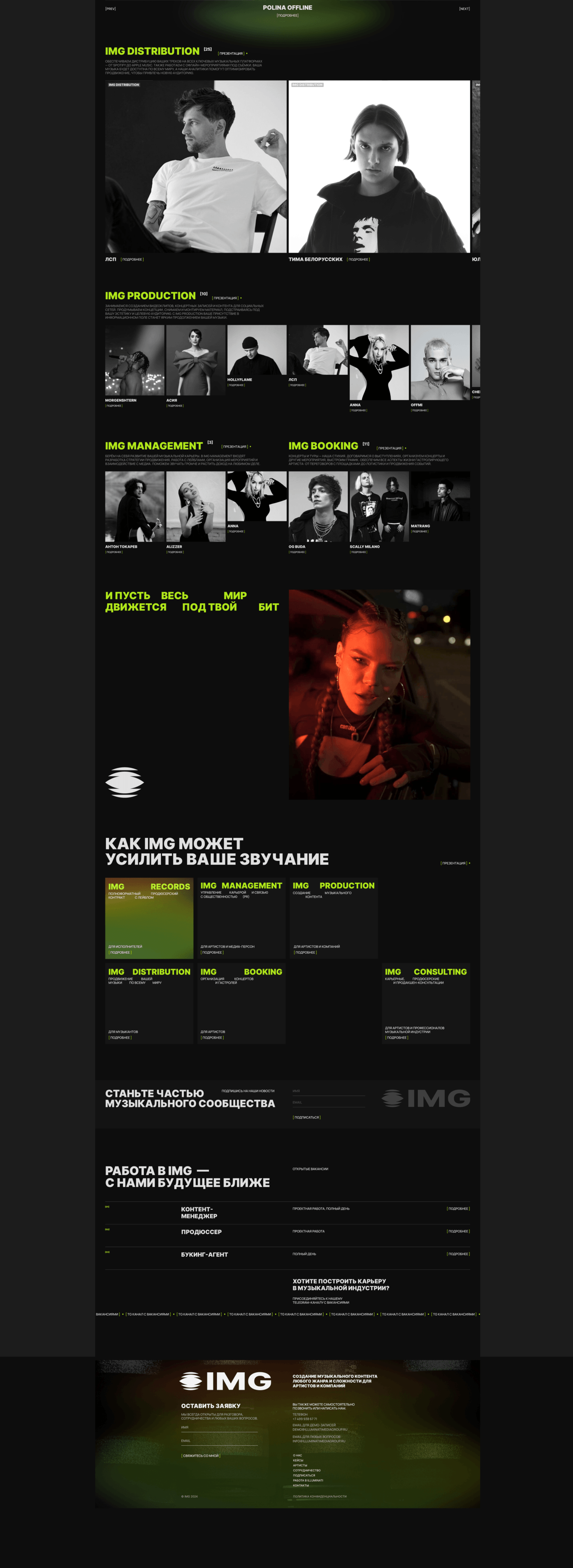 Основная задача заключалась в том, чтобы обновить сайт музыкального лейбла IMG в соответствии с их новой бизнес-моделью. Ранее IMG фокусировался только на управлении собственными артистами, предоставляя им услуги записи, продюсирования и продвижения. Теперь лейбл расширил свои услуги, начав предлагать их на аутсорсе для сторонних клиентов. Старый сайт не отражал этих изменений: структура и дизайн устарели, не выделяли компанию на фоне конкурентов и не демонстрировали разнообразие предоставляемых услуг. Требовалось создать современный, яркий и функциональный сайт, который бы показывал как услуги для артистов, так и возможности для сотрудничества с клиентами из других сфер музыкального бизнеса.