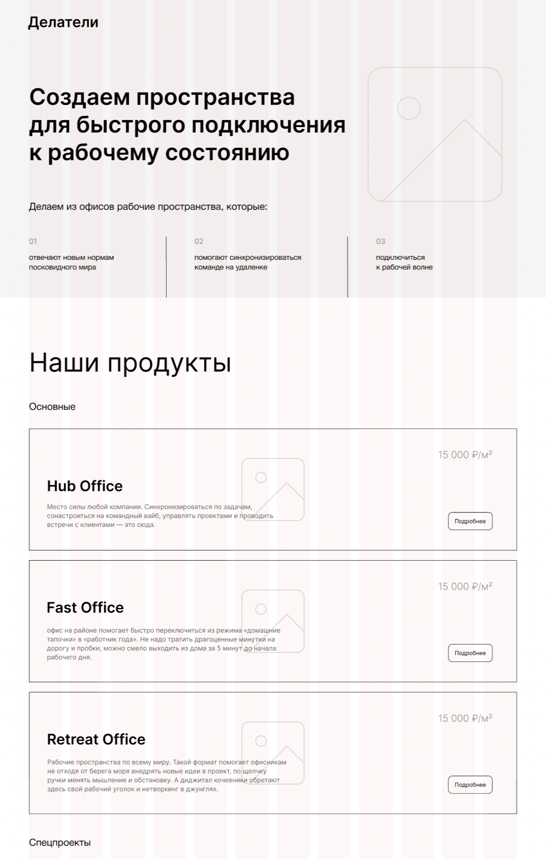 Перенося визуальную концепцию на структуру, мы стремились подчеркнуть ту атмосферность и прогрессивность, которыми гордятся «Делатели.Офисов». В итоге получился стильный и современный сайт.