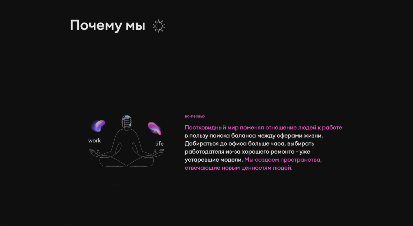 Мы подготовили три прототипа с различной структурой. В ходе обсуждения выбрали решение, которое лучше всего подходит задачам клиента — посетитель сайта сразу узнает об услугах и преимуществах компании. Следующие за ними описание подхода к работе и портфолио подкрепляют ощущение профессионализма и экспертности. А блок «Что происходит в мире» простым языком объясняет, почему так важно создавать рабочие пространства нового типа.