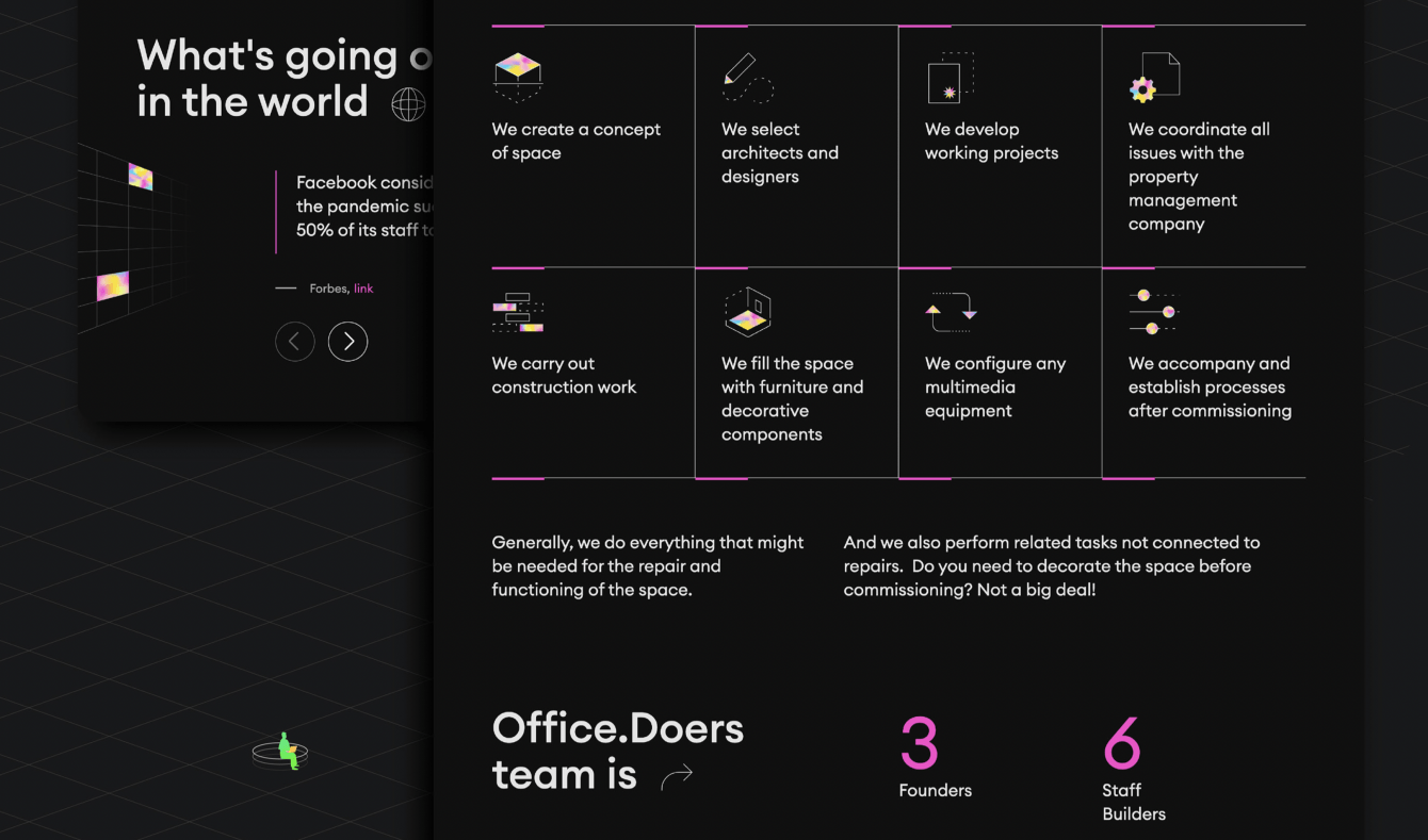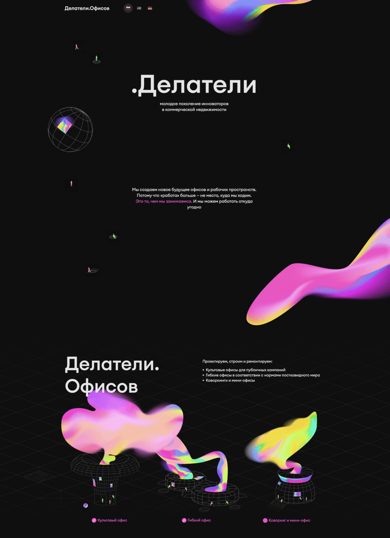 В феврале 2021 года к нам обратились «Делатели.Офисов» – молодое поколение инноваторов в коммерческой недвижимости. Они занимаются созданием пространства, заряженного на рабочий вайб. Компания попросила нас создать сайт, соответствующий их современному и смелому подходу.