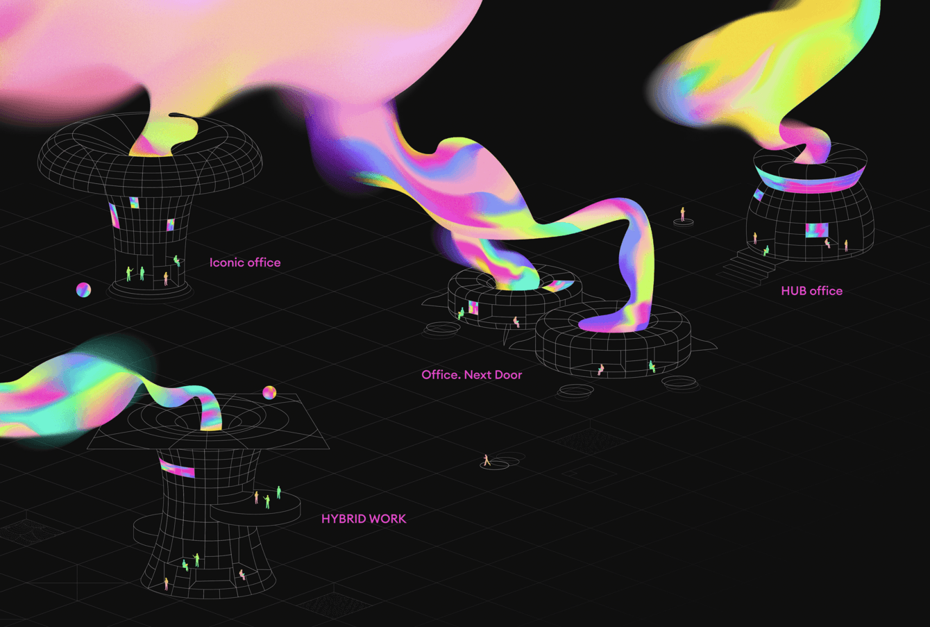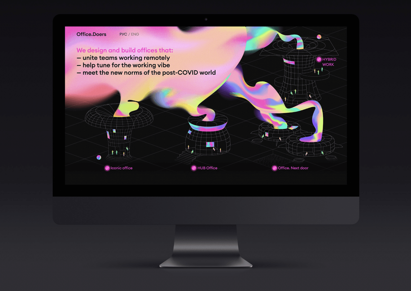 Образы понравились клиенту, и мы перешли к следующему этапу — детальной проработке и добавлению цвета! Палитра и яркие сочетания поддерживают мысль, которую должен доносить сайт: «Делатели.Офисов» работают круто, необычно и совершенно по-новому.