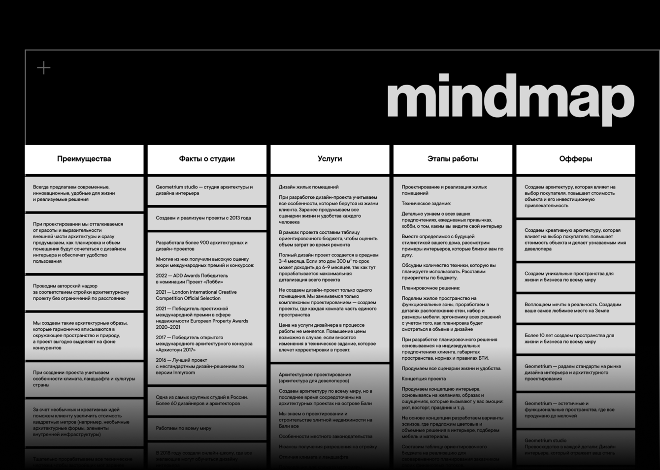 • Следующим этапом стало погружение в детали. Мы пообщались с ключевыми специалистами. Это позволило нам узнать все этапы работы, подход к созданию проектов, а также особенности каждого направления деятельности.