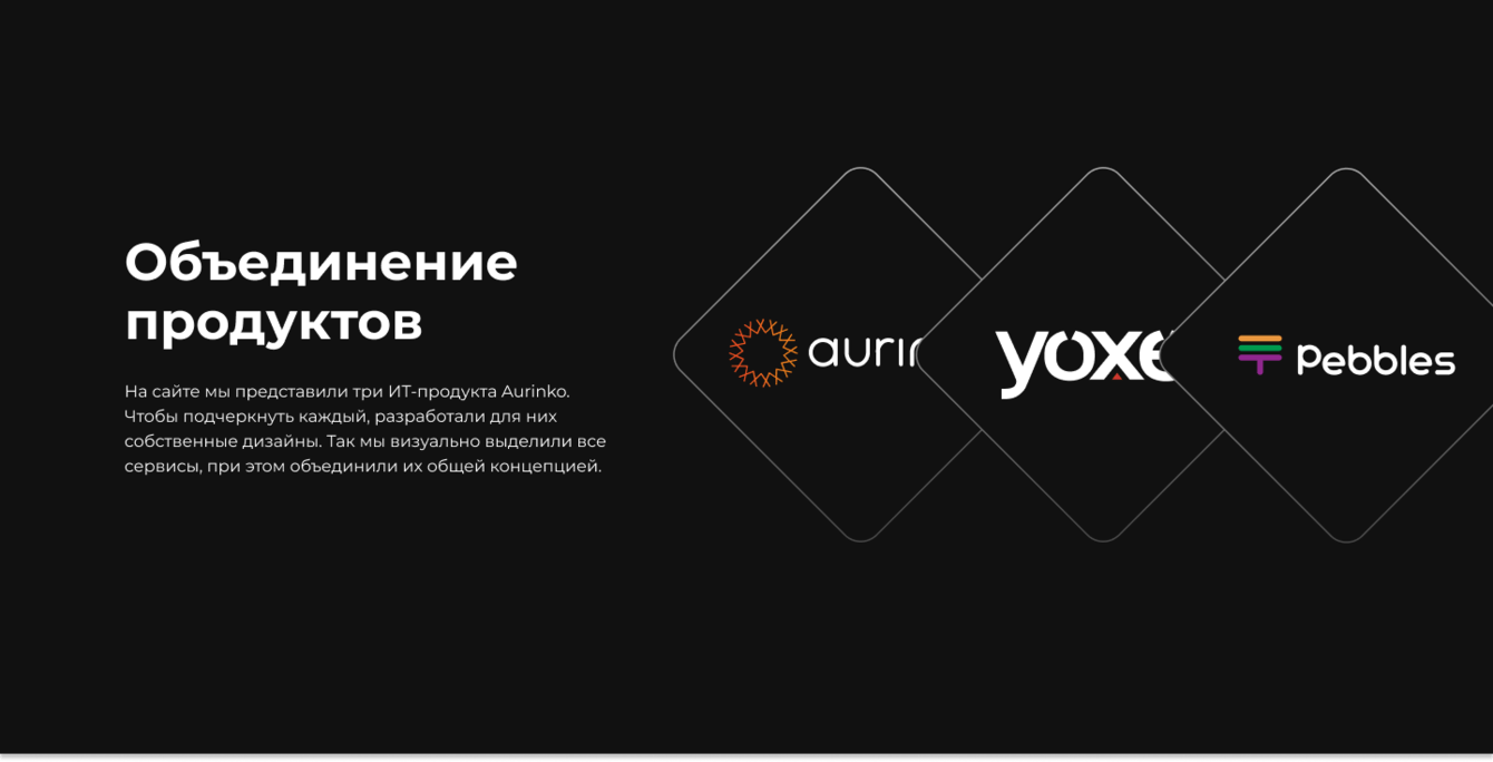 На сайте мы представили три ИТ-продукта Aurinko. Чтобы подчеркнуть каждый, разработали для них собственные дизайны. Так мы визуально выделили все сервисы, при этом объединили их общей концепцией.
