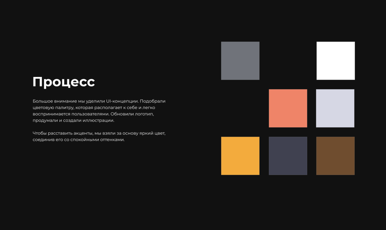 Большое внимание мы уделили UI-концепции. Подобрали цветовую палитру, которая располагает к себе и легко воспринимается пользователями. Обновили логотип, продумали и создали иллюстрации. Чтобы расставить акценты, мы взяли за основу яркий цвет, соединив его со спокойными оттенками.