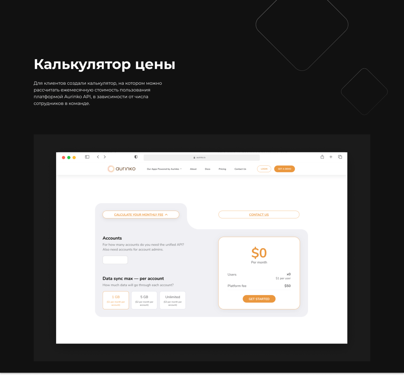 Для клиентов создали калькулятор, на котором можно рассчитать ежемесячную стоимость пользования платформой Aurinko API, в зависимости от числа сотрудников в команде.