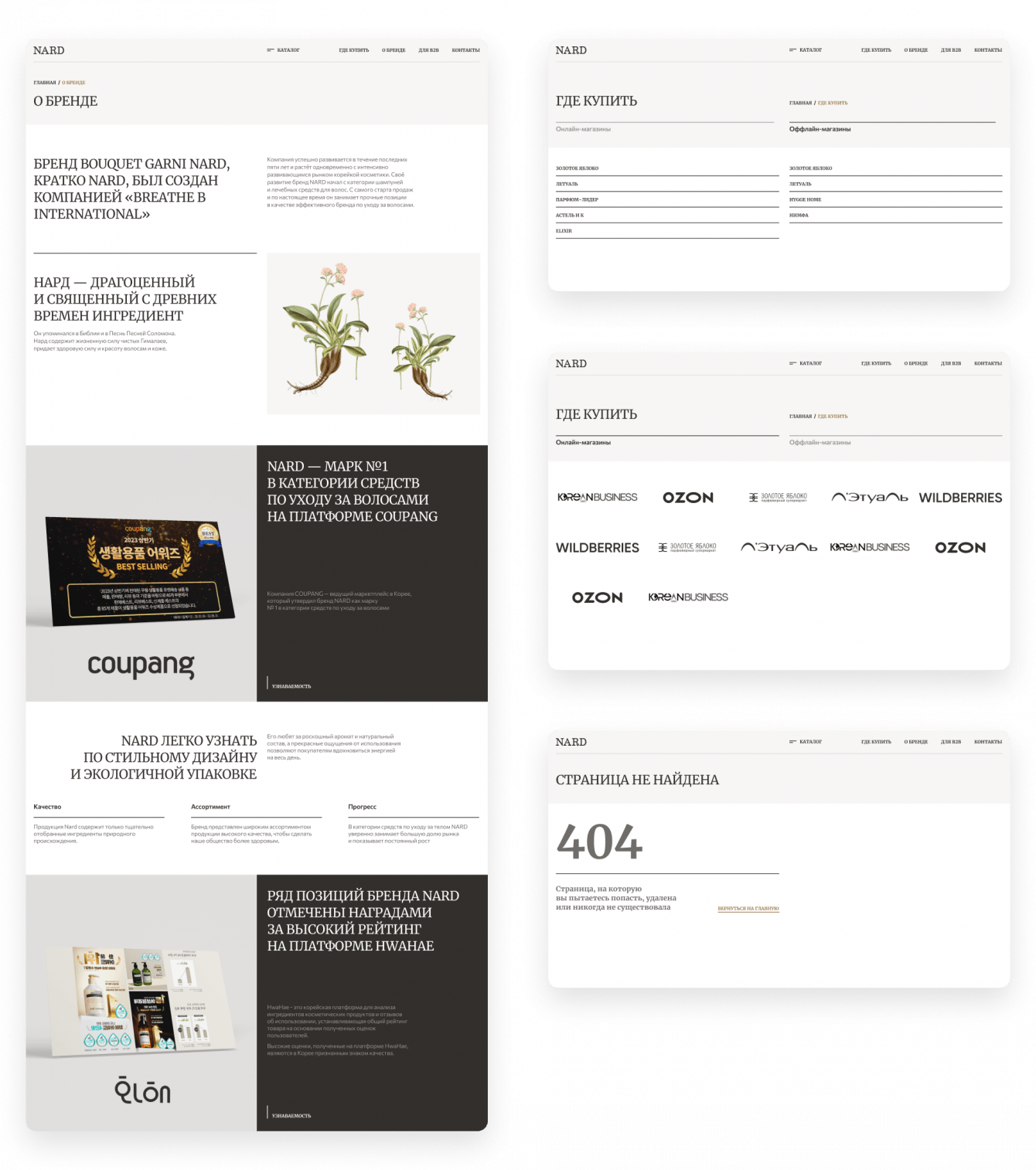 При работе над проектом важно было сохранить идентичность бренда, при разработке дизайна мы отталкивались от оригинального корейского сайта компании, который был предложен нам в качестве референса. Перед нами стояла задача поддержать имидж NARD. Ориентируясь на все материалы и готовые дизайны бренда, мы сделали дизайн-макет в похожей стилистике, так как очень важно сохранить единство бренда во всех его проявлениях.