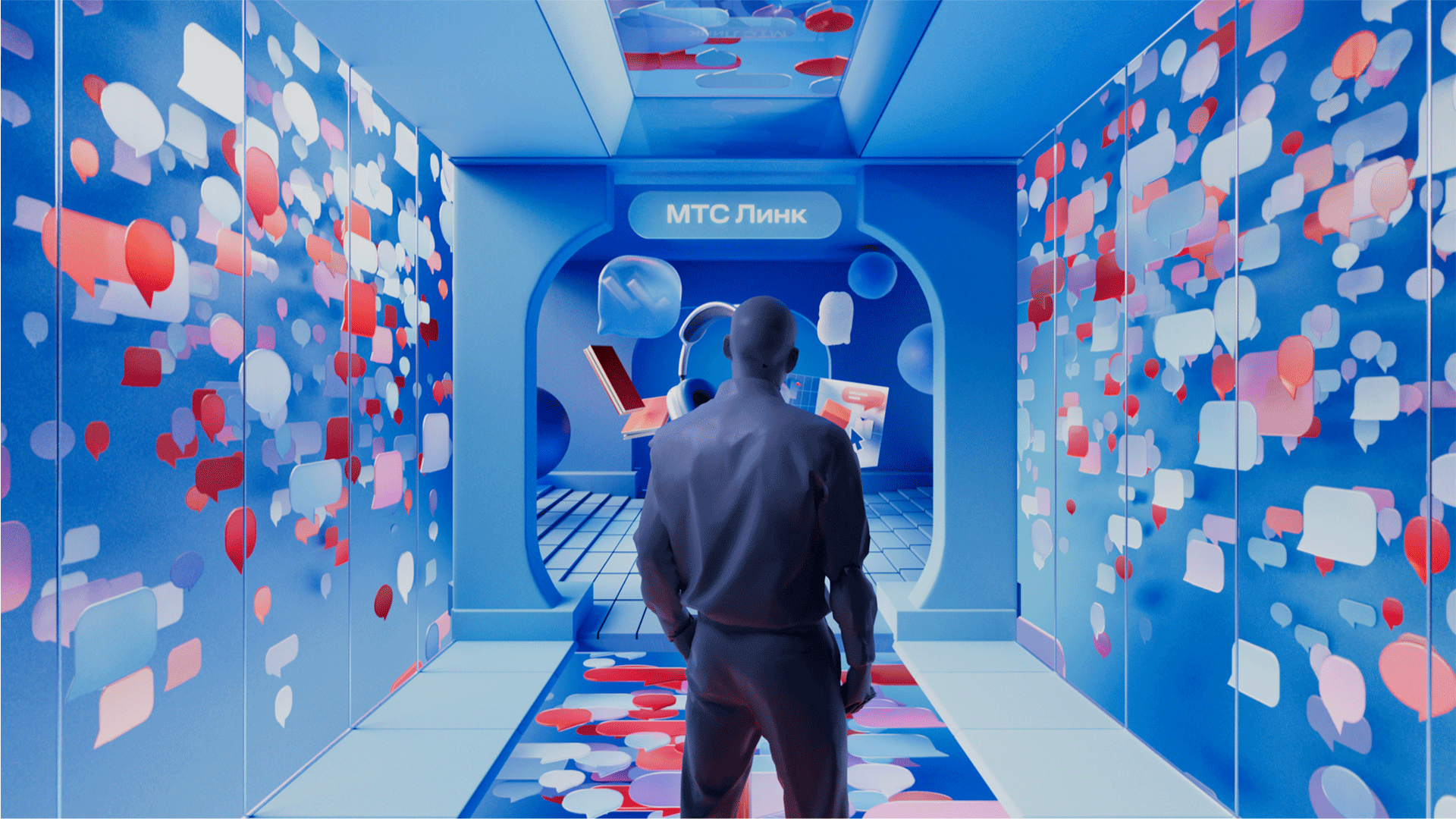 В инсталляции мы решили рассказать о том, как внедрение технологической платформы МТС упрощает решение бизнес-задач и автоматизирует процессы, помогая предпринимателю. Возникла идея создать иммерсивную комнату. Это позволяло не только спроектировать уникальный опыт для пользователя, но и решило бы проблему ограниченного пространства, расширив физическое пространство куба до целой виртуальной вселенной – прямой метафоры экосистемности цифровых продуктов МТС Бизнес.