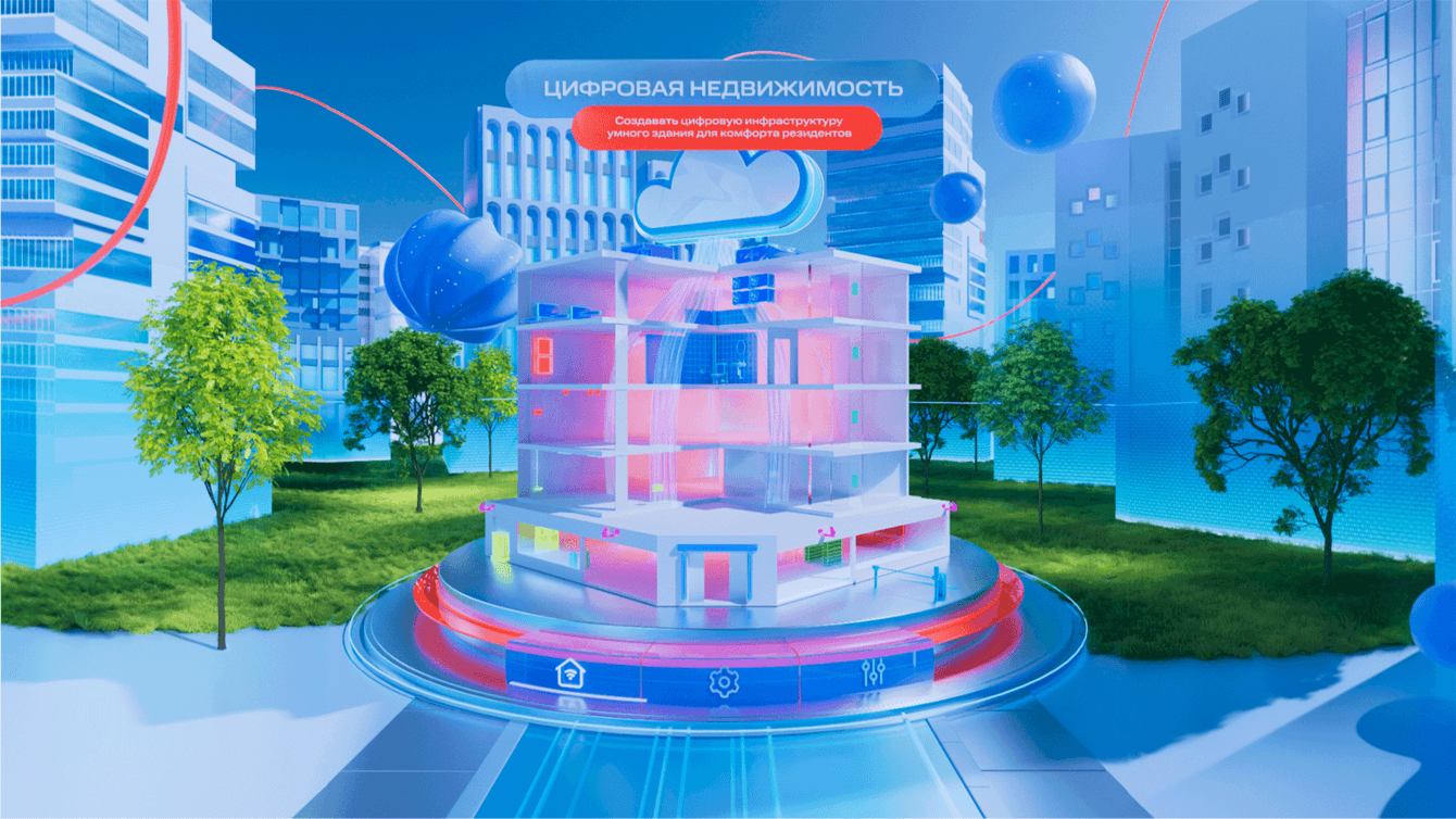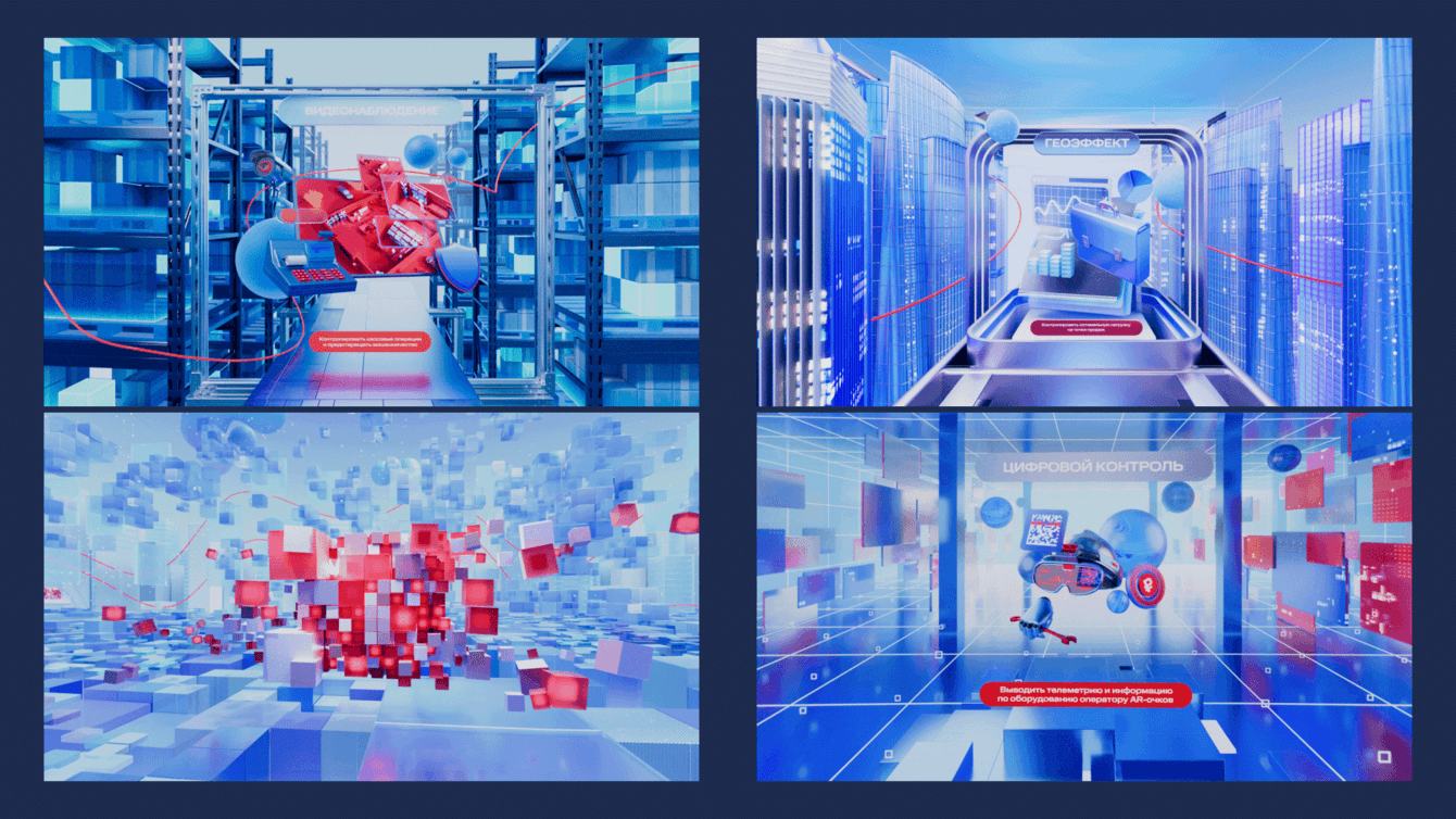 “По каждому продукту мы определили задачи, которые он решает и выстраивали ключевой образ через их визуализацию. Например, чтобы показать услугу “Геоэффект”, мы нарисовали зрелищную сцену пролета над городом, в конце которой демонстрировался образ продукта. Главный образ располагался на центральном экране перед пользователем, а на боковых стенах комнаты отображалось его уникальное окружение. Каждый из миров – это абстрактное пространство, тематически связанное с продуктом. В центре этого пространства мы более детально раскрывали суть продукта” – рассказывает Артем Бабаев, Арт-директор студии Akademia.