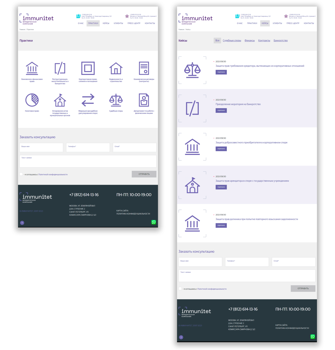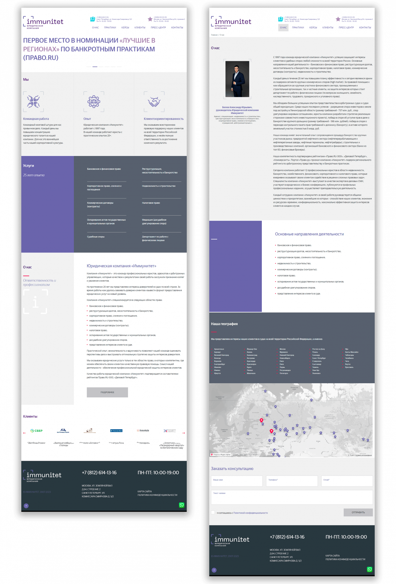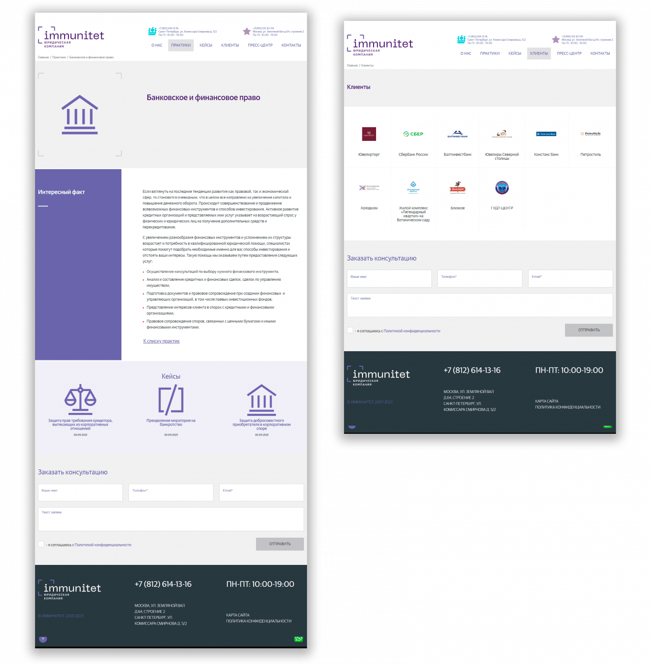 Компания «Иммунитет» специализируется на юридической поддержке в сфере банковского, финансового, корпоративного и налогового права, а также на ведении дел, относящихся к недвижимости и банкротству. Корпоративный сайт, действовавший на момент обращения в Студию Силуэт, был выполнен компанией своими силами и реализован не в полном объеме.