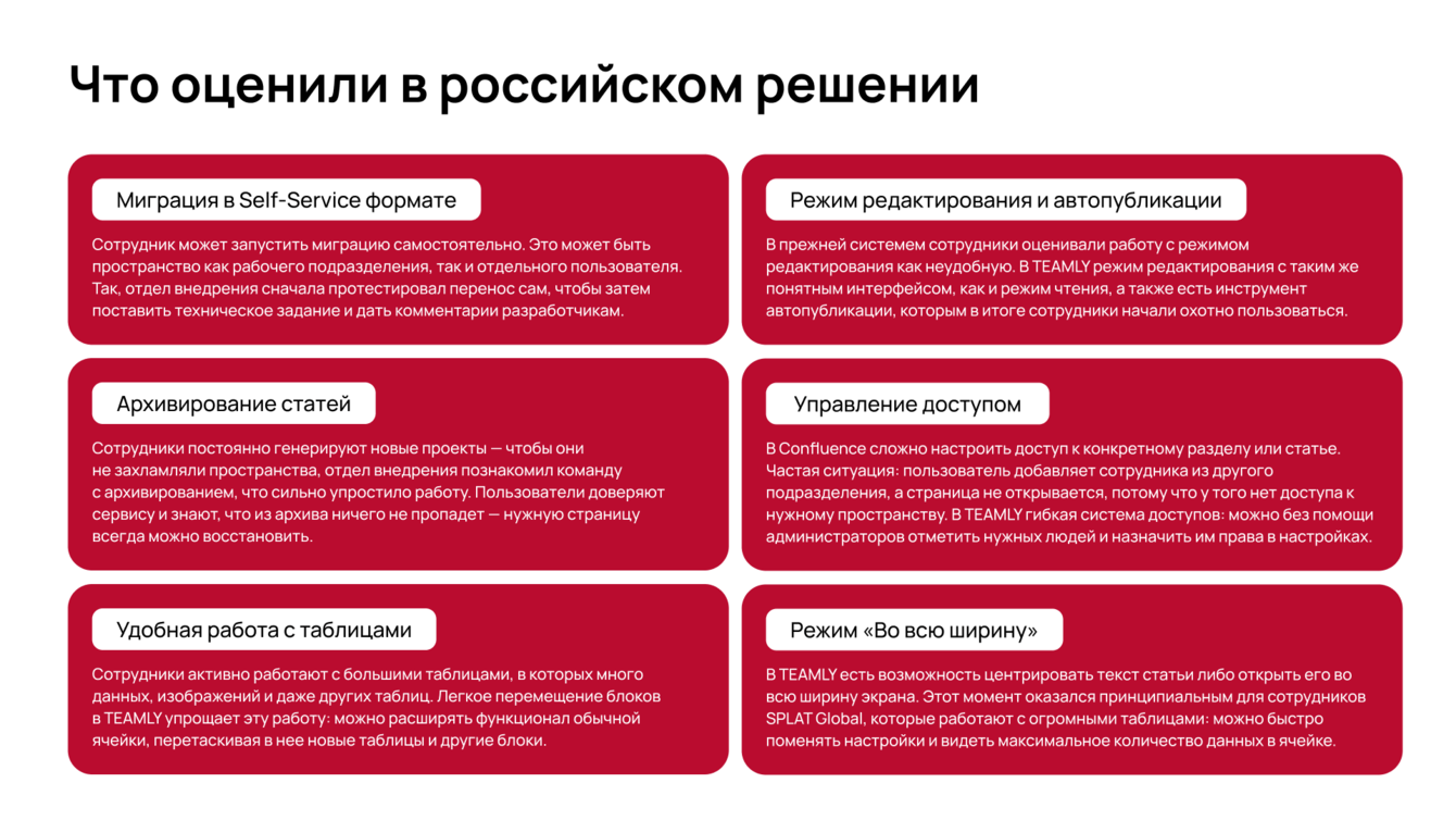 • Необходимо было быстро мигрировать на новое решение, что потребовало чёткого планирования и согласования усилий всей команды — как со стороны SPLAT Global, так и со стороны TEAMLY.