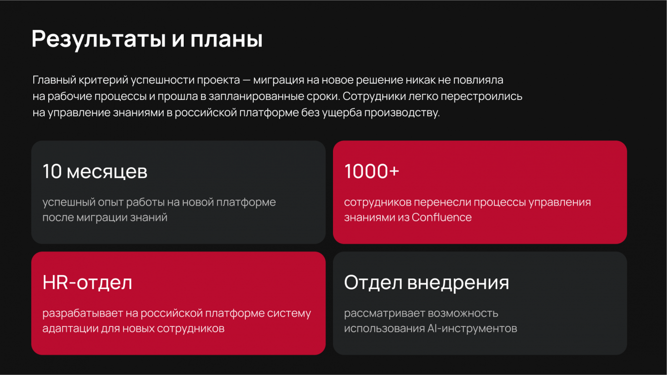 Сработал эффект превосходящего ожидания: мы не просто выполнили задачу полного импортозамещения Confluence, но ещё и переосмыслили подходы к управлению знаниями и работе с ними.