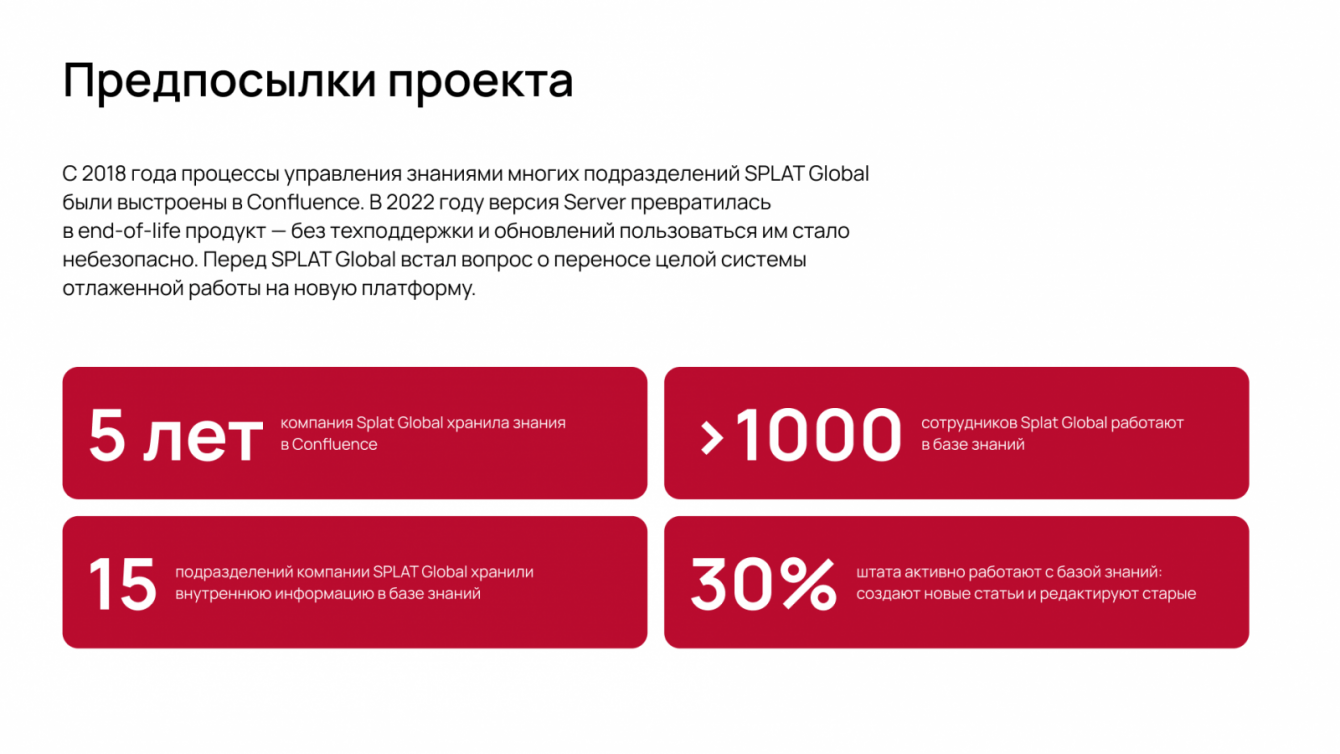 • Заменить текущее решение на базе Confluence на российское программное обеспечение, чтобы избавить команду SPLAT Global от рисков санкционного влияния и решить проблему невозможности получать обновления и техническую поддержку.