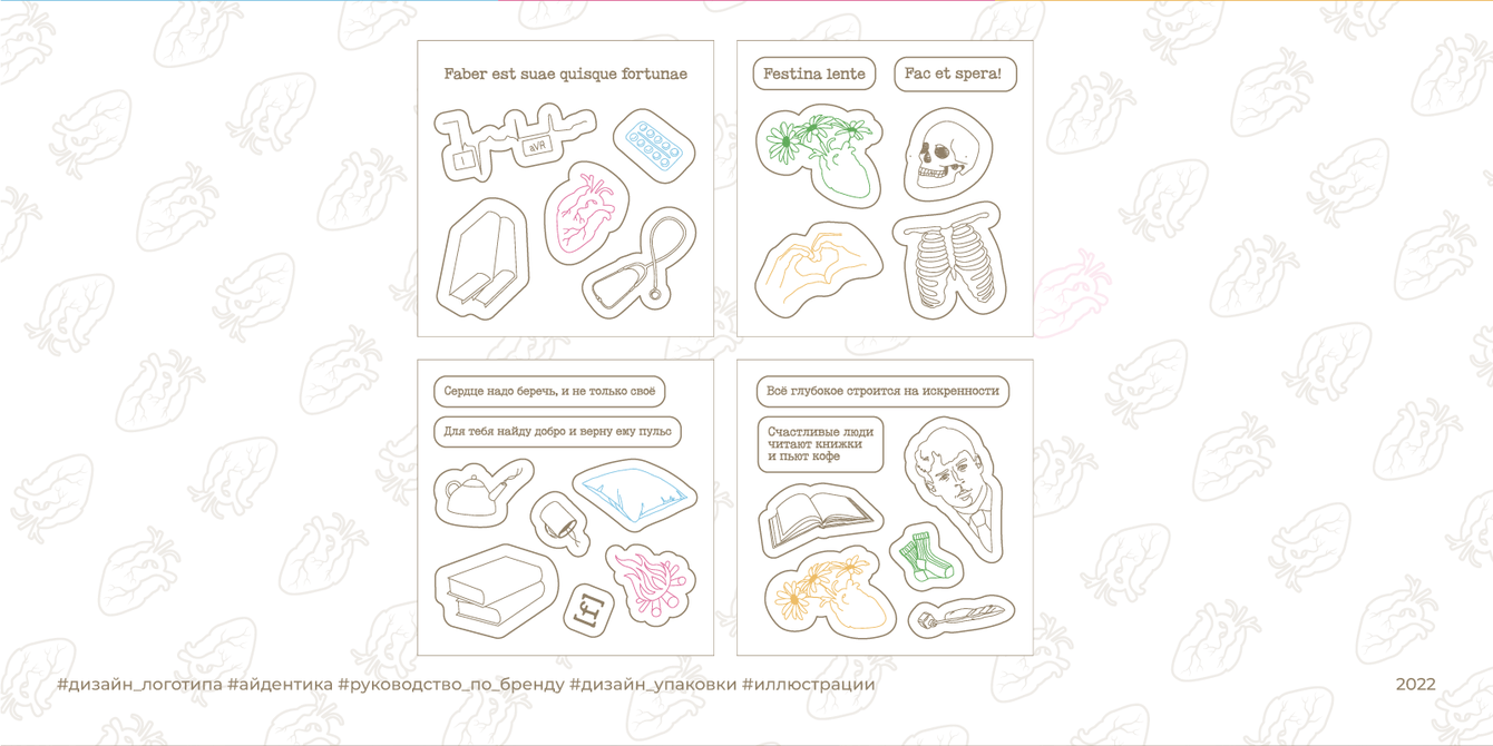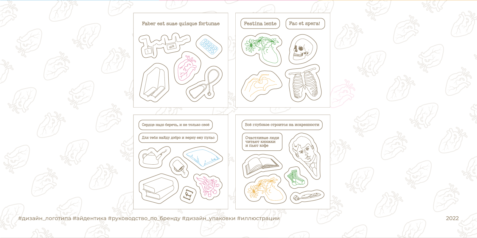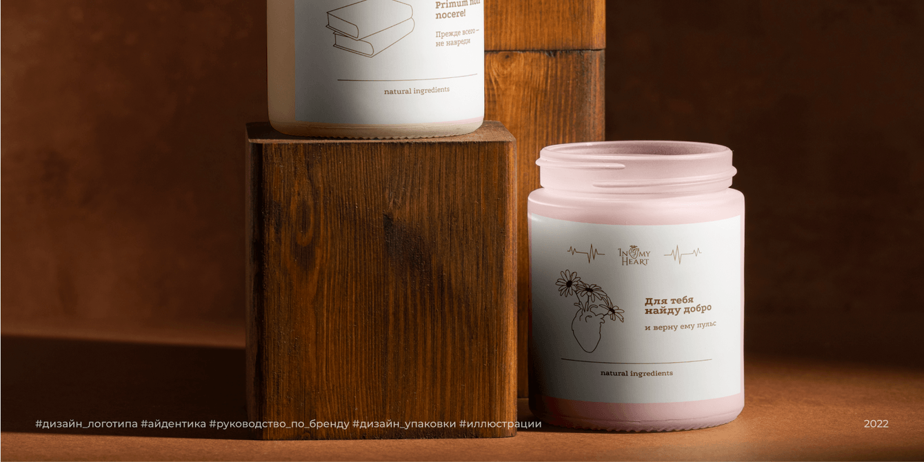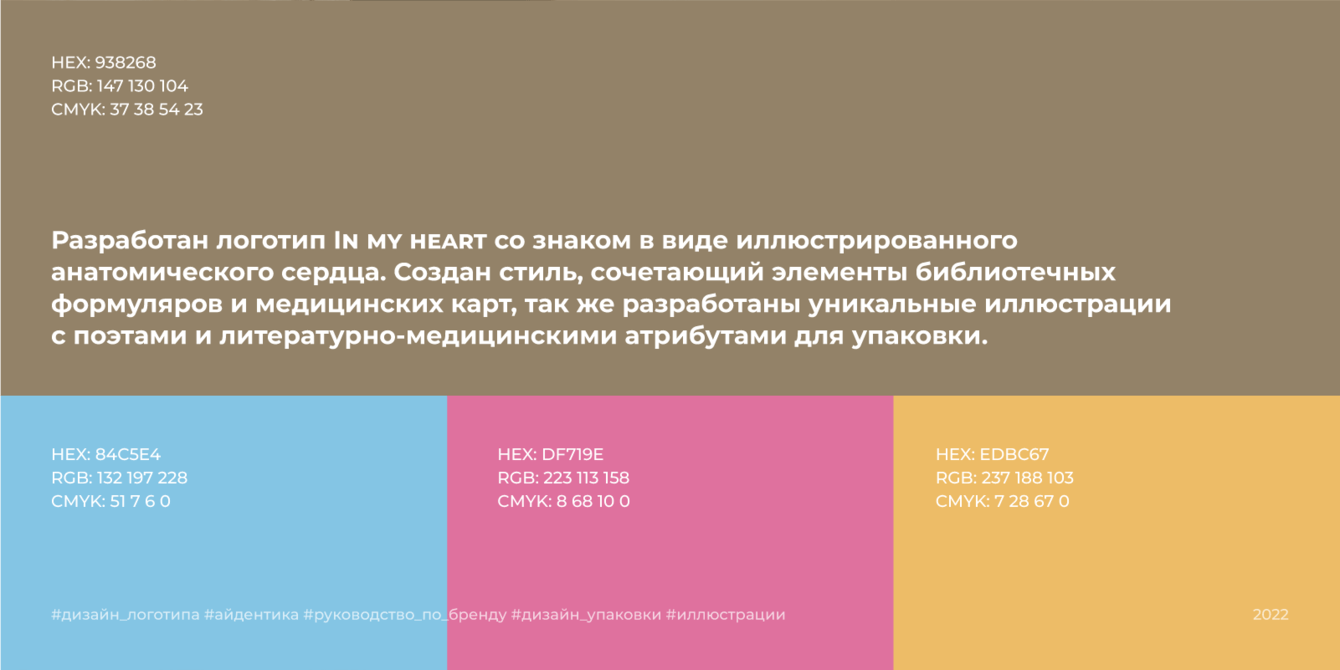 Разработан логотип In my heart со знаком в виде иллюстрированного анатомического сердца. Создан стиль, сочетающий элементы библиотечных формуляров и медицинских карт, так же разработаны уникальные иллюстрации с поэтами и литературно-медицинскими атрибутами для упаковки.