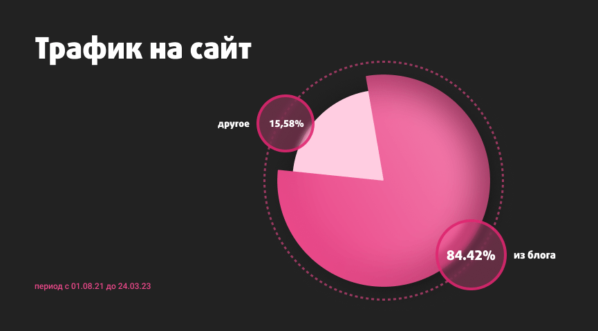Что касается трафика и заявок. К моменту написания статьи рост трафика из блога — 84.42%, а процент заявок со статей — 33%.