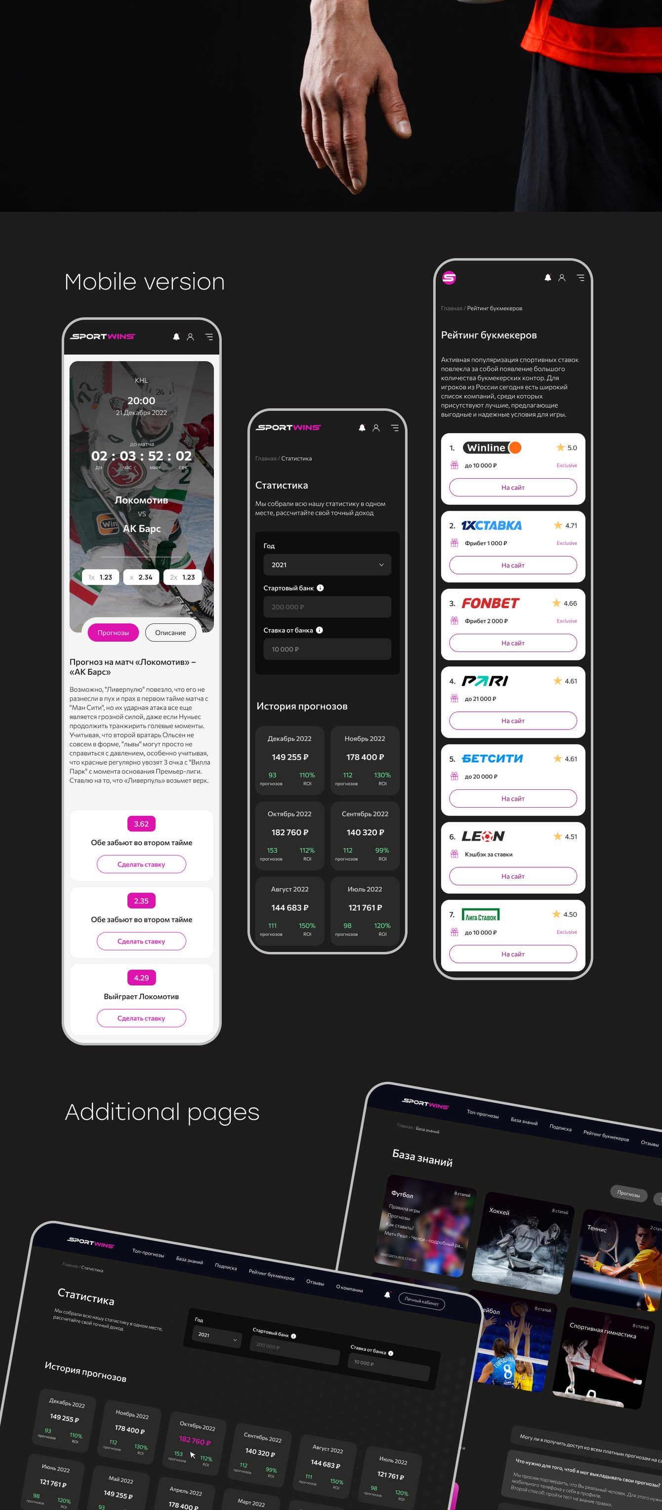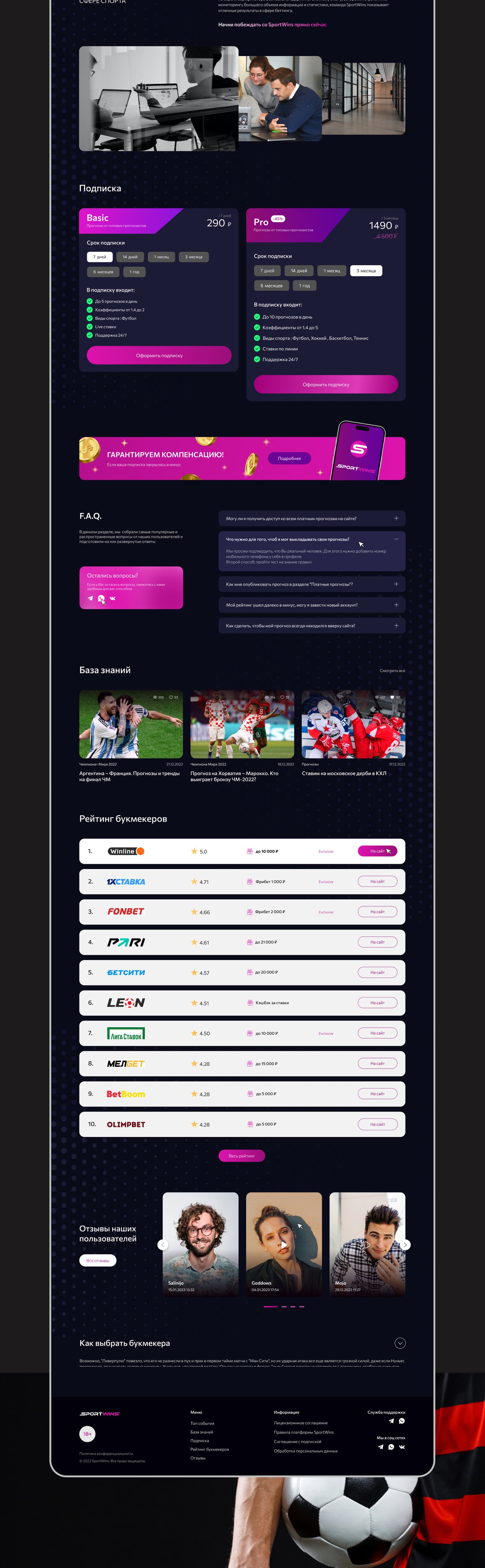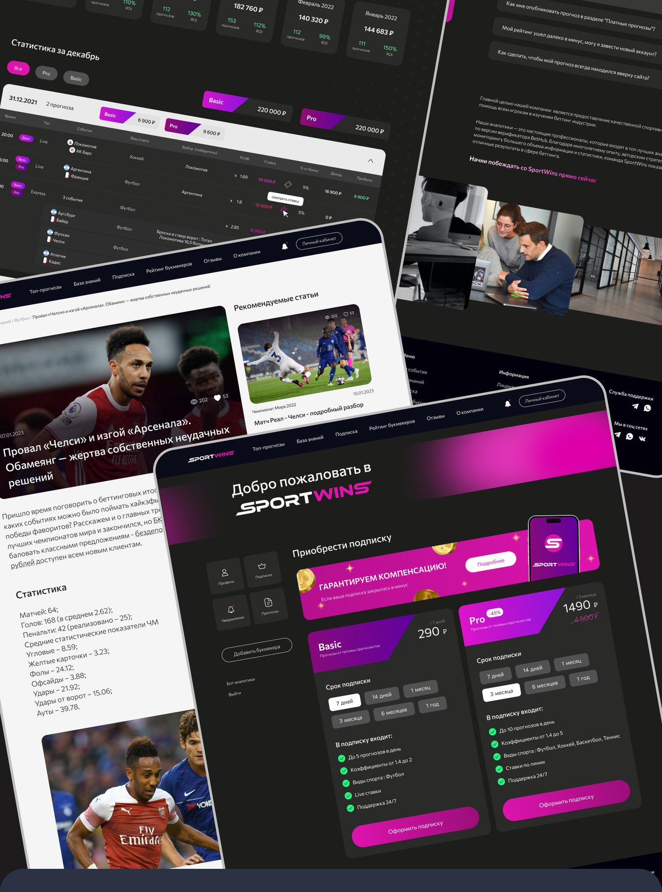 Разработали дизайн на основании логотипа заказчика и приступили к дизайн-макетам, предварительно согласовав прототип. При реализации дизайн-макетов стали уже видны недостатки сервиса, после чего мы их успешно исправили путем отрисовки макетов по поведению клиента на сайте. Разработали автоматическую генерацию статистики на основании ранее добавленных платных прогнозов. Сделали сервис по добавлению ТОП-прогнозов (бесплатных) для привлечения клиентов. Разработали сайт на системе управления, сделав удобным быстрое редактирование прогнозов, провели большие настройки под работу СЕО-шников, генератор title на основании категорий, клубов и матчей.