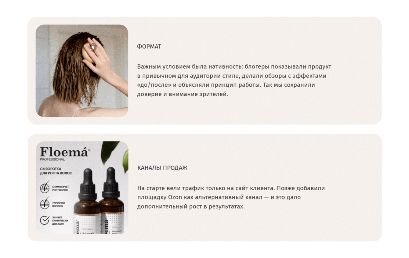 Мы определили, что аудитория лучше реагирует на реальные истории, а не «глянцевые» ролики. Предложили решение: инфлюенс-маркетинг с нативными интеграциями. Блогеры показывали продукт в привычном для аудитории стиле, делали обзоры в процессе использования, показывали «до/после» и объясняли принцип работы. Так мы сохранили доверие и внимание зрителей, а ещё обеспечили рост конверсий.