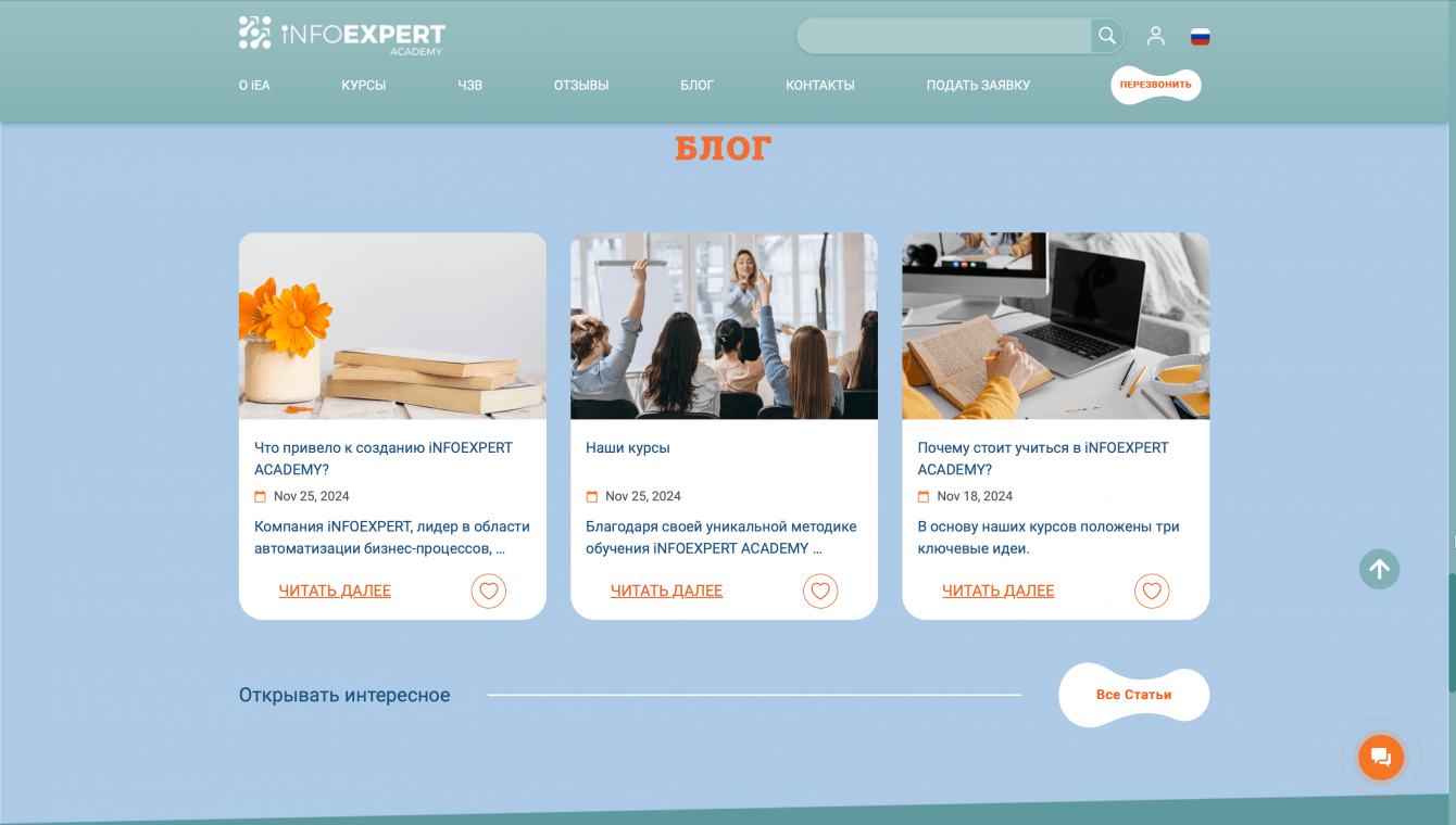Созданный сайт с индивидуальным дизайном стал не только удобной платформой для покупки курсов, но и мощным инструментом для управления обучением. Интеграция всех необходимых систем и функций значительно упростила работу команды iNFOEXPERT и повысила удобство для пользователей, которые теперь могут легко записываться на курсы, следить за прогрессом и проверять свои знания.