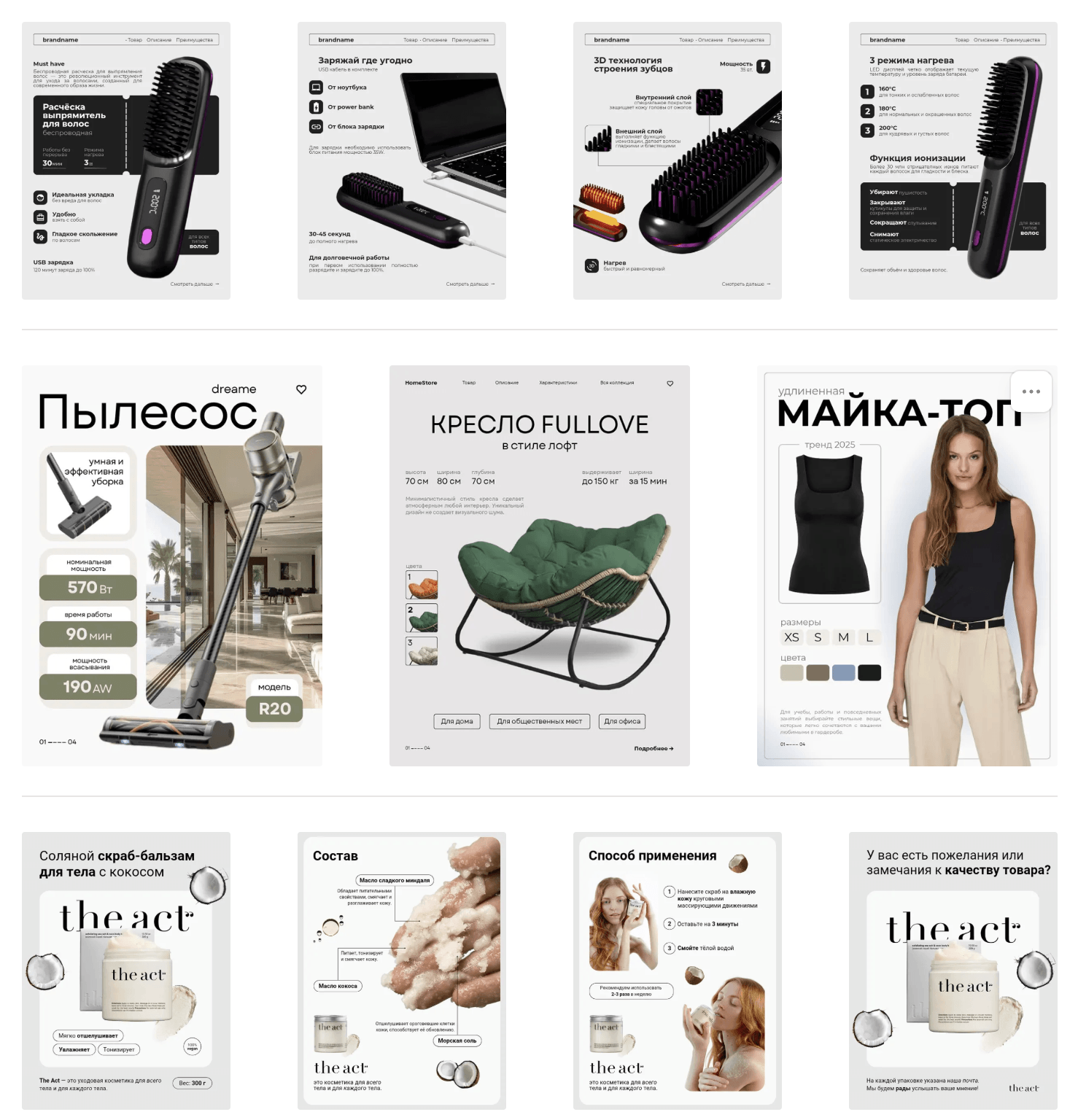 Я стремилась сделать техническую информацию простой для восприятия, чтобы покупатель мог сразу понять суть товара. Данные превращаются в наглядную и привлекательную подачу, которая помогает быстрее принять решение.