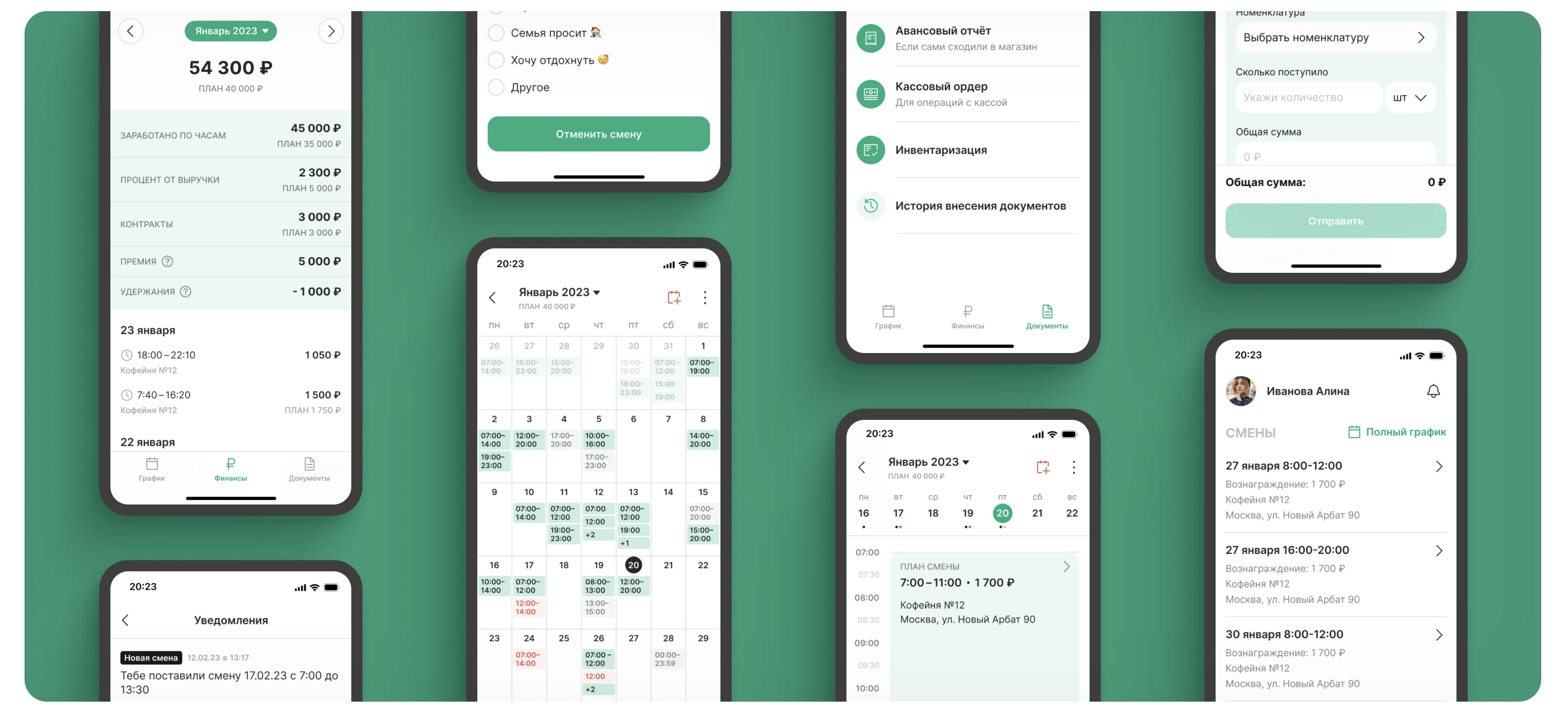 - Финансовый раздел с детальной информацией о каждой смене в мобильном приложении для бариста.