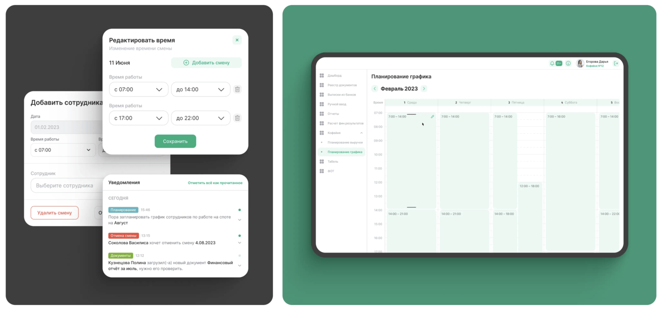 - Создали раздел с планированием выручки и графиком работы сотрудников, что позволило понимать сотрудникам стратегические цели компании и следить за их достижением, а также планировать ежедневную нагрузку на остальной персонал заведений.