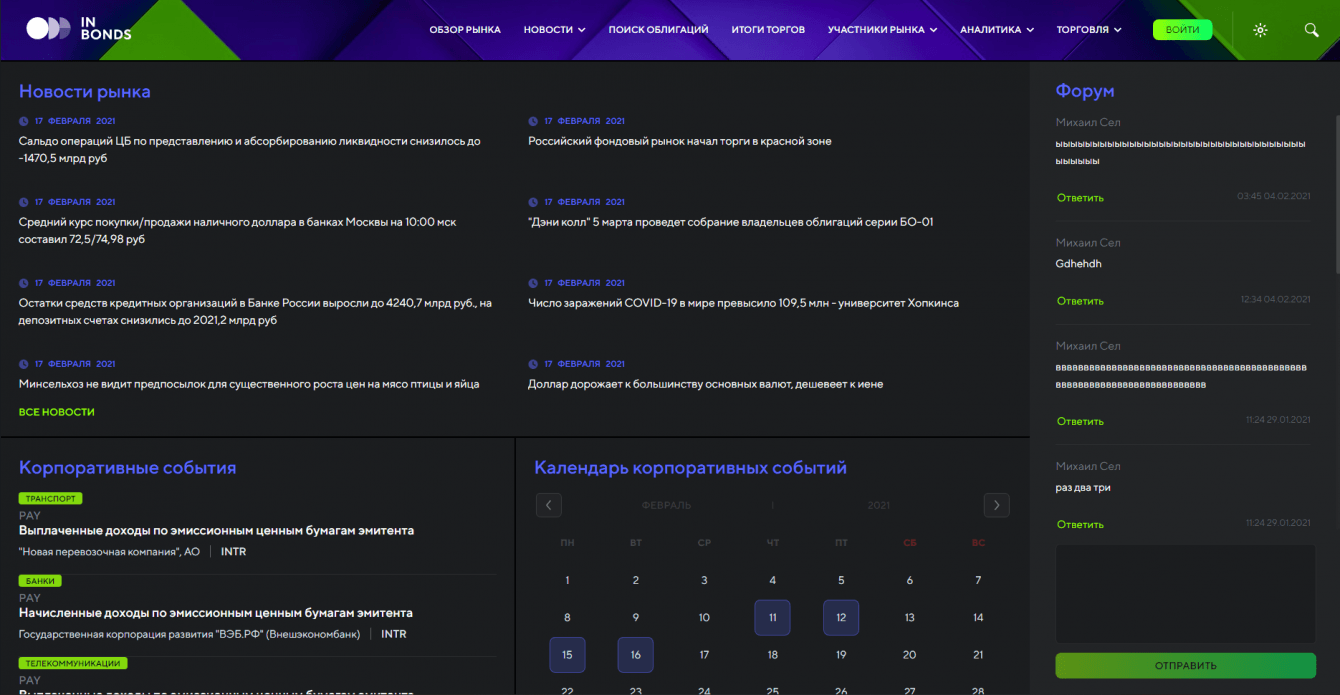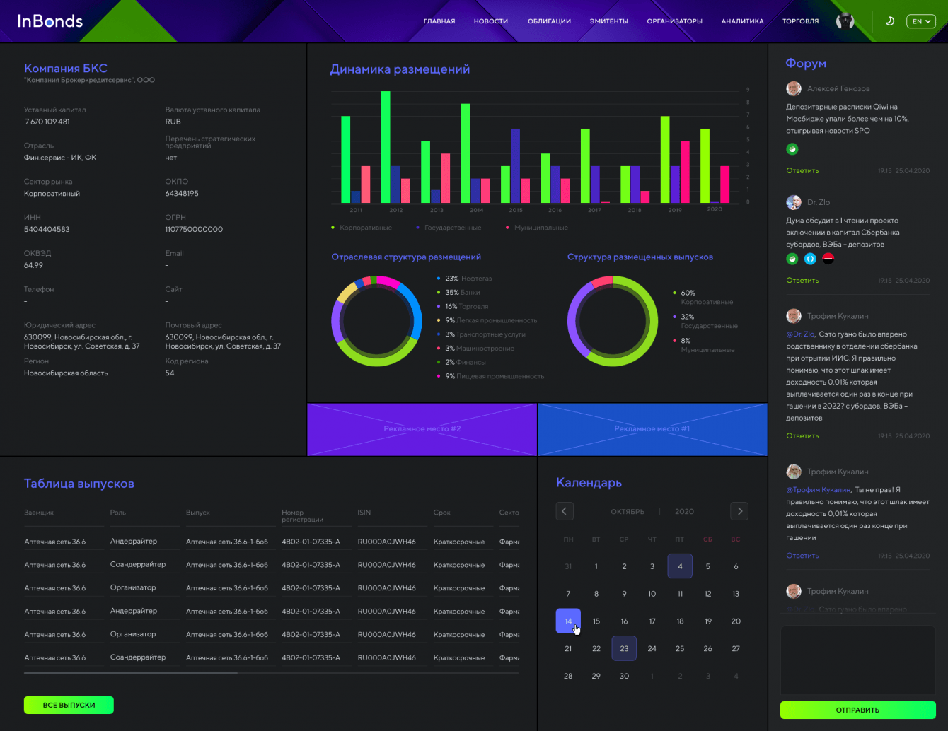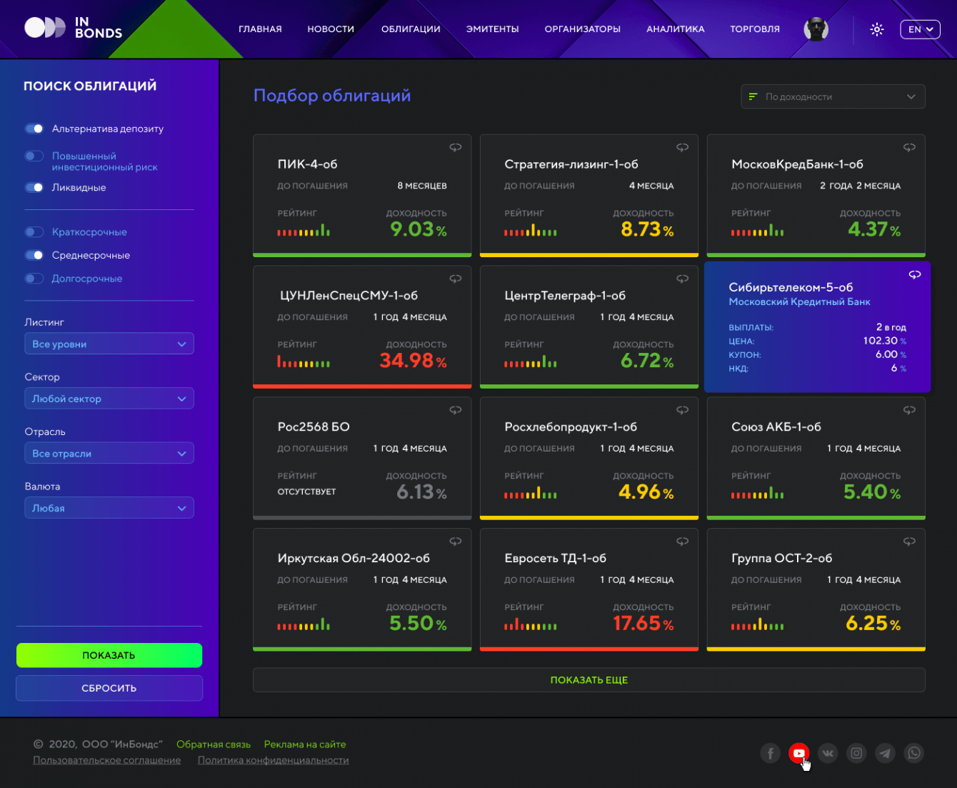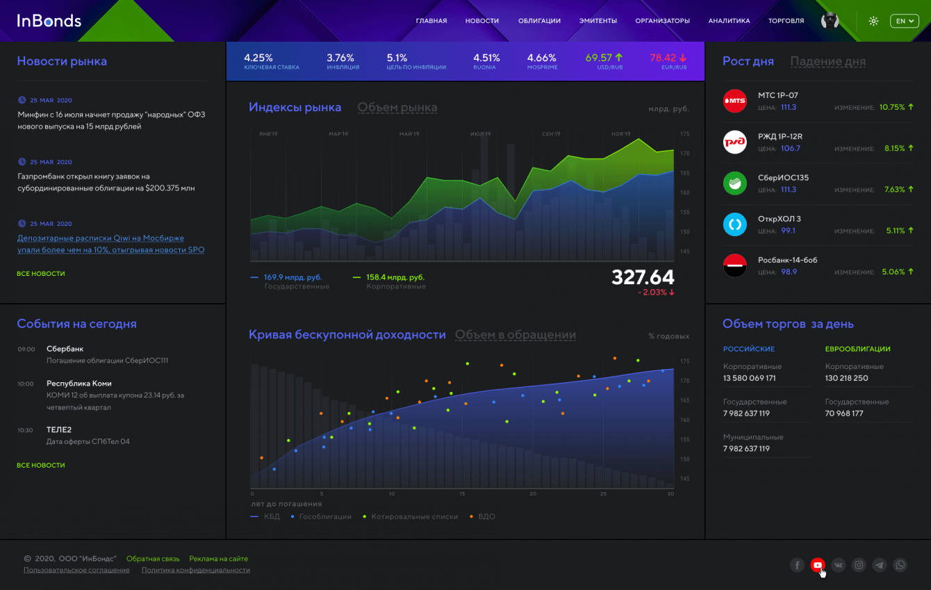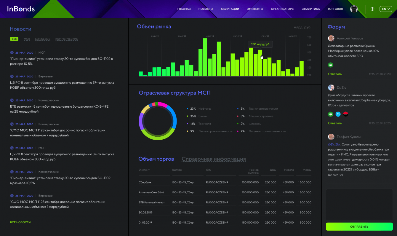 Реализовано web-приложение аккумулирующее в своем интерфейсе данные множества новостных сервисов и сервисов информации об облигациях, эмитентах и сделках, предоставляющее пользователям такие аналитические инструменты как калькулятор облигаций, технический анализ, интерактивная карта, сравнение облигаций.