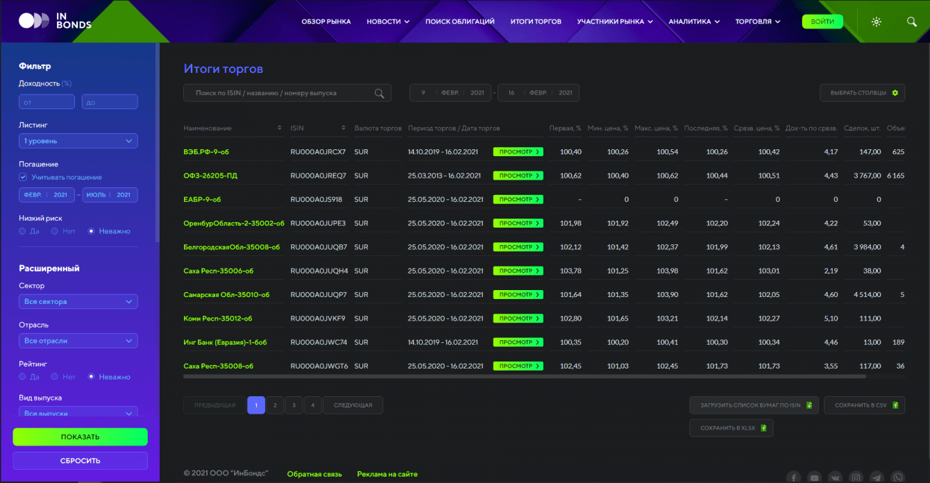 Разработать web-приложение, которое предоставляет информацию о рынке облигаций. Приложение должно быть ориентировано на различные категории пользователей. Сервис должен быть рассчитан как на профессиональных инвесторов, которым необходим детальный аналитический функционал, позволяющий оценить доходность, ликвидность и риски инвестиций, так и на начинающих инвесторов, находящихся в поиске более доходных направлений размещения накоплений, нуждающихся в простом, интуитивно понятном решении, позволяющем сделать выбор облигаций для инвестиций, отслеживать динамику стоимости вложений, получать рекомендации по корректировке вложений.