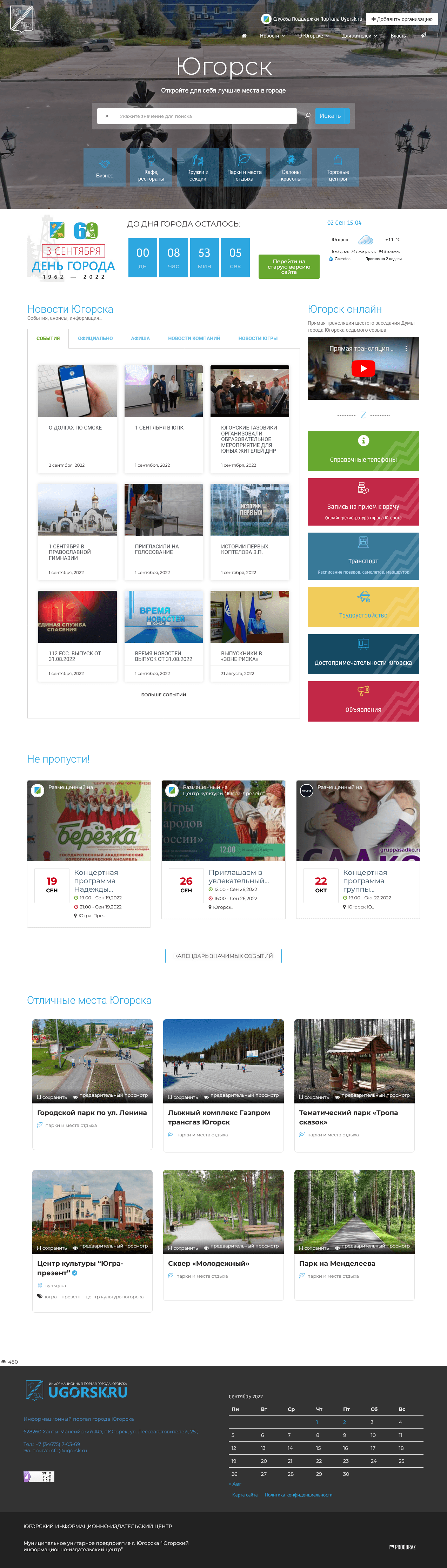 Сайт создается под базовые потребности человека в городской среде, которые затрагивают вопросы: где отдохнуть, поесть, сделать покупки; где может быть интересно и что происходит. Для этого внедрены активные информационные техники и функционал, позволяющий организациям Югорска размещать информацию о себе с привязкой к карте и разделением по спектрам деятельности. Новостной контент в большей степени формируется в автоматическом режиме из контента муниципальных учреждений города, снимая при этом нагрузку с редакторов сайта.