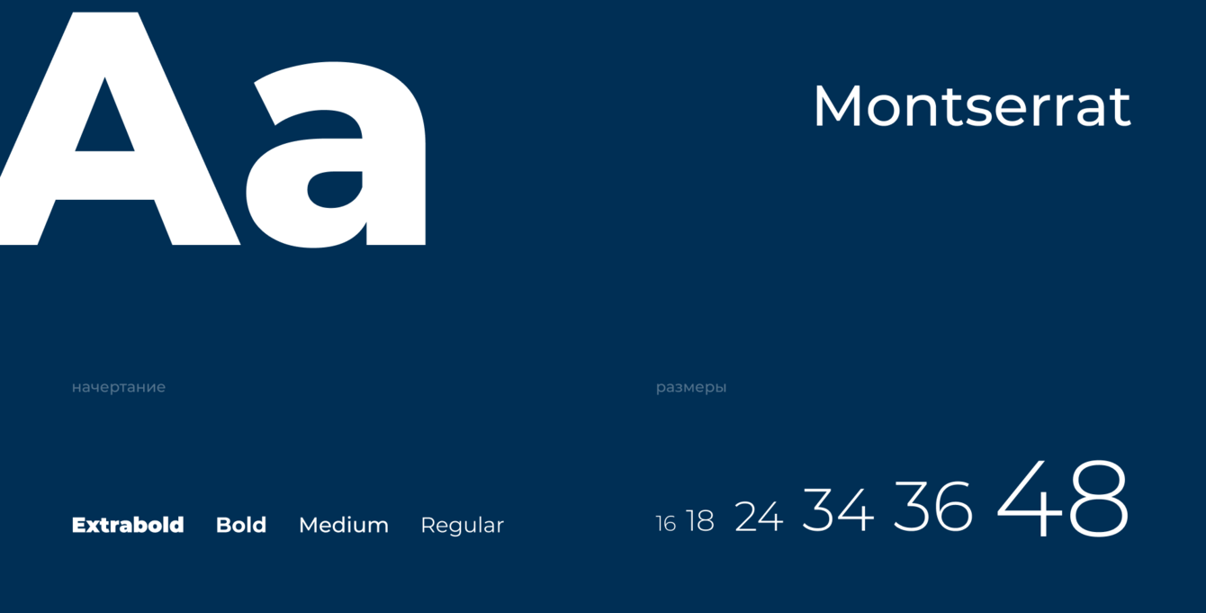 Для заголовков и основного текста, мы выбрали декоративный шрифт Montserrat. Гарнитура содержит 18 начертаний. Он гармонично вписался в концепцию проекта. Наличие открытой лицензии позволяет свободно использовать его в коммерческих проектах.