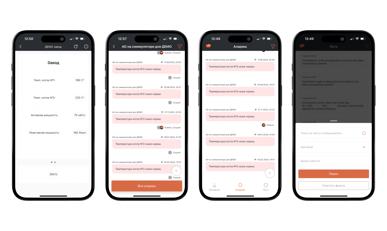 Приложение работает со всеми необходимыми по плану технологиями: REST API для получения основных данных, SignalR для моментального получения сообщений об авариях и о статусах устройств на объектах. Push-уведомления реализованы для оповещения об авариях высшего приоритета и для подтверждения изменений в устройствах.