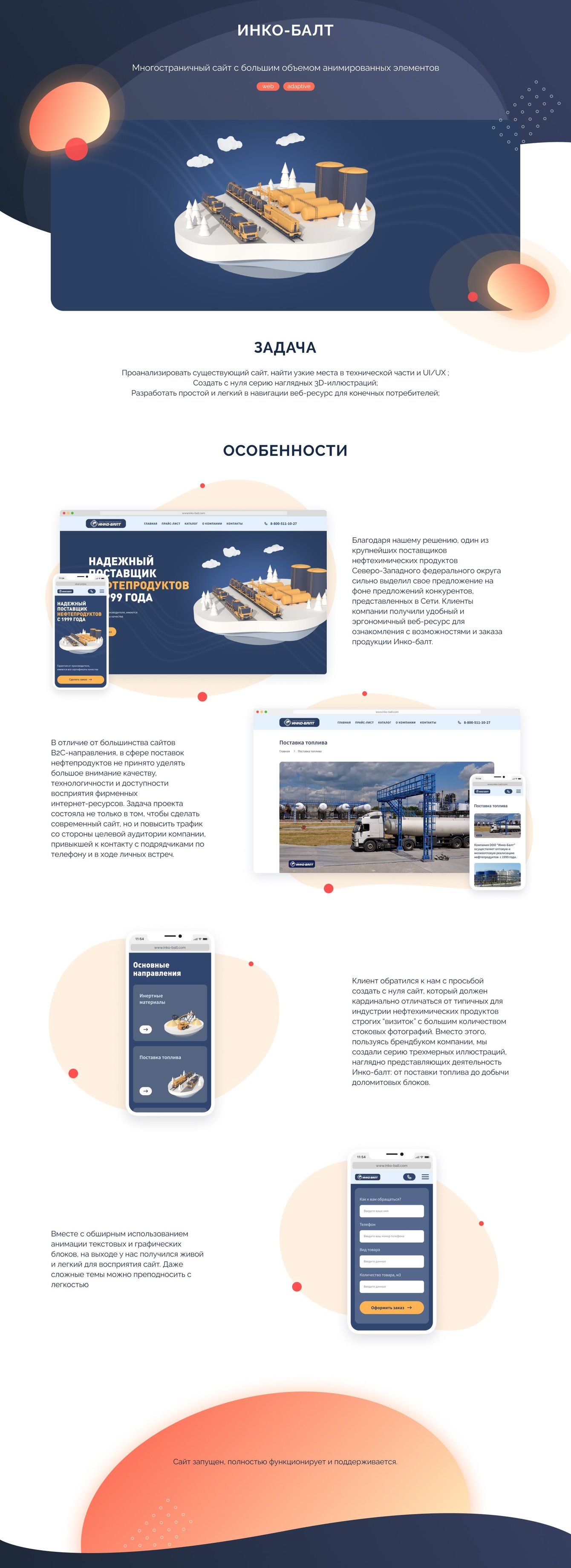 Пользуясь брендбуком компании, мы создали серию трехмерных иллюстраций, наглядно представляющих деятельность Инко-балт: от поставки топлива до добычи доломитовых блоков. Вместе с обширным использованием анимации текстовых и графических блоков, на выходе у нас получился живой и легкий для восприятия сайт. Даже сложные темы можно преподносить с легкостью